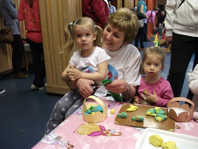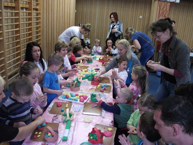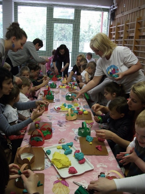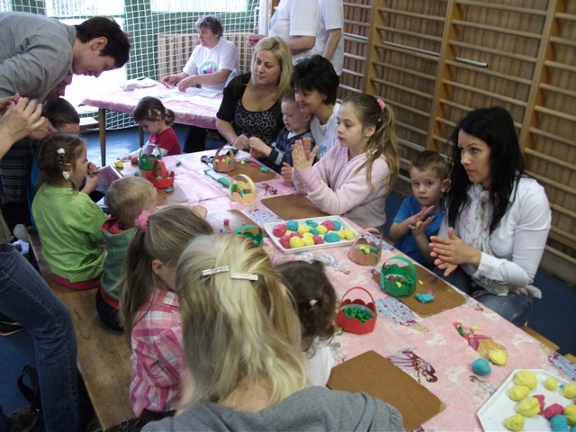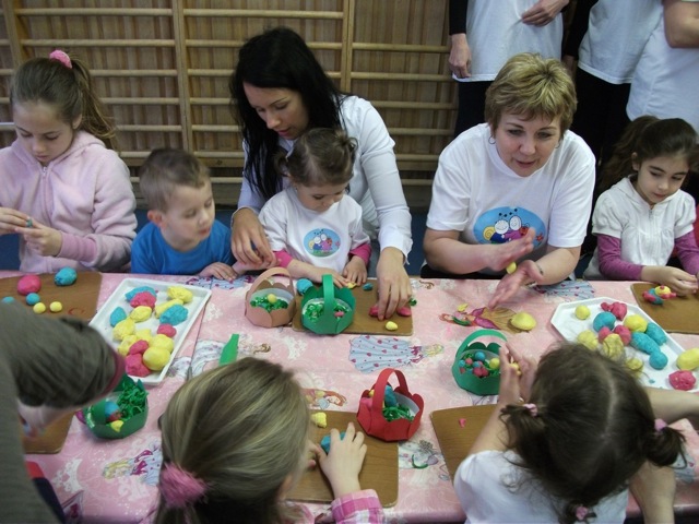 A kissé borongós időjárás sem riasztotta el az érdeklődőket, így hamar megtelt a tornaterem önfeledten játszó kisgyermekekkel. Legtöbben otthonosan érezték már magukat, hiszen ötödik alkalommal ismerkedhettek az óvodával, az óvó- és dajka nénikkel és nem utolsó sorban egymással. Ez alkalommal a mozgásos játékok mellett húsvéti hímes tojásokat készíthettek, melyeket kis kosárkában vihettek haza.