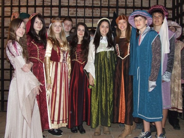 A vasárnapot mindenki a családoknál töltötte. Hétfőn a délelőtti munka és az Európa napi programok után kibicikliztünk a Szalmaportára. Itt a háziak kapusznyikával és lekváros kiflivel vendégeltek meg minket. Sokan készítettek szalmából kicsi lepke figurát, míg mások az ördöglakatokat próbálták kinyitni kisebb-nagyobb sikerrel. Kedden ismét egész napos kiránduláson vettünk részt. A Gyulai Vármúzeum termeit végigjárva betekintést nyerhettünk a középkori magyarok történetébe. Emellett mindenkinek nagy élményt jelentett –lányoknak, fiúknak, sőt tanároknak is – hogy reneszánsz ruhákba öltözhettünk be, melyekben végigsétálhattunk a vár udvarában, gyakran nagy derültség közepette. Délután egy közeli lovas tanyán fogyasztottuk el a bográcsban készült paprikáskrumplit, majd lovaskocsikáztunk, sőt a bátrabbak lovagolhattak is. Az idő és a kedvünk is derűs volt.