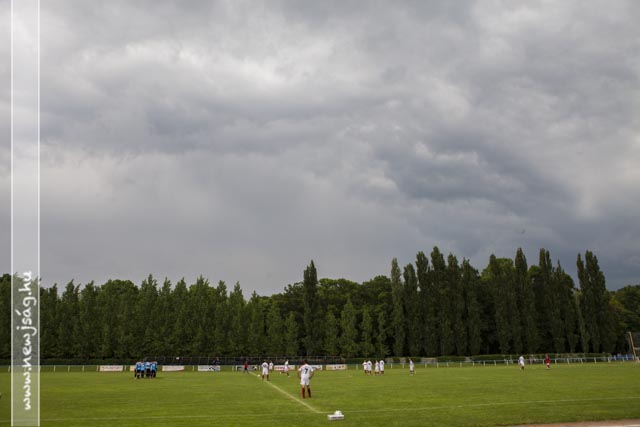 Ekkor elkezdett esni az eső. Először ritkásan, majd leszakadt az ég. Pillanatok alatt jégpályához hasonlóvá vált a gyep. A szurkolók a lelátóra menekültek, a játékosok meg sehová. Az első félidei eredményt Lós állította be a negyedik szarvasi góllal.