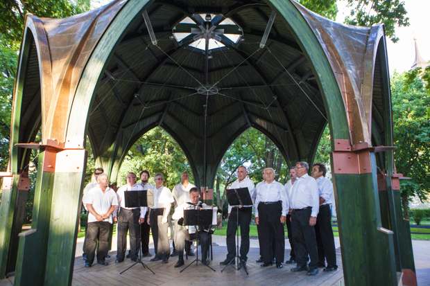 A programmal kapcsolatban nem kell nagy dologra gondolni, csak egy 20-30 perces kis zenei programra, amihez azért érdemes lesz az esti sétát időzíteni, mert megéri. Szombaton este még csak néhányan ültek a hatalmas tölgyek alatt levő padokon, de ez hamarosan változni fog, mert nagyon hangulatosnak ígérkezik a sorozat, amint az kiderült tegnap, amikor elsőként a Szarvasi Férfikórus lépett a deszkákra Iváncsó József vezetésével és népdalcsokrokat, nemzeti ünnepeinkhez kapcsolódó dalokat és katonadalok mellet szórakoztató dalokat is énekeltek a szerelemről, a pálinkáról, az ivászatról. Repertoárjukba felvették kóruselődjük, a két világháború között virágkorát élő Szarvasi Dalkar három, Rohoska Géza karnagy által írt nótáját is.