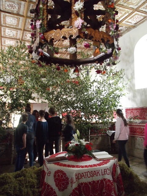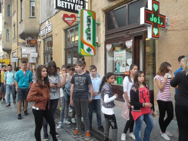 a nemzeti összetartozás érzését erősítse a jelenlévőkben. Átadtuk a gyerekek számára összeállított kis ajándékokat, amelyek mellé – Edit néni saját készítésű karkötői, kulcstartói és az apróságokon kívül – egy-egy városunkról összeállított mappát is átnyújtottunk. Zsolt és Sándor számára Szarvast bemutató könyveket vittünk, hogy kedvet csináljunk számukra a viszontlátáshoz. Ezután elsétáltunk a várba, ahol koszorút helyeztünk el a székely vértanúk kopjafájánál, mialatt az énekkarosok elénekelték a Fölszállott a páva kezdetű dalt. Megtekintettük a Teleki Téka múltillatú könyvgyűjteményét, majd a Kultúrpalotát, amelynek üvegablakai székely mondákat idéznek. Lehetőséget kaptunk arra, hogy bemehessünk a zsinagógába, ahol megismerkedhettünk a marosvásárhelyi zsidóság történetével, és a ma is ott élő maroknyi zsidó mindennapjaival. A tikkasztó melegben a Rózsák terén tölthettünk egy órácskát.