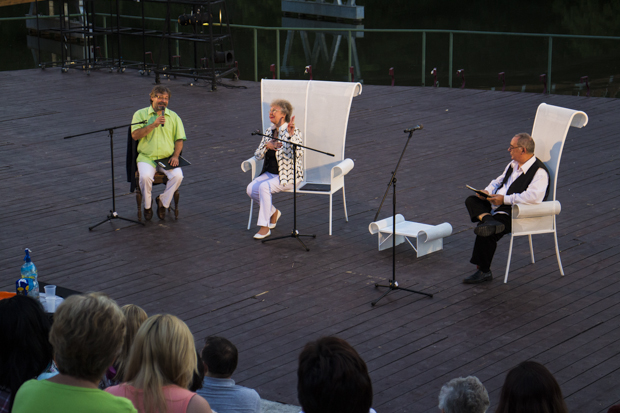 Kubik Anna helyett Fodor Zsóka, Mészáros Mihály és maga, Seregi Zoltán „ugrott be”. Mészáros Mihály éppen a napokban kapott díjat egy váratlan, parádés „beugrásáért”, amit az István, a király című darabban tett meg. Állíthatom, beugrása hétfőn este is parádésra sikerült. A dalok, kuplék amelyeket elénekelt, tűzbe hozták a közönséget. Fodor Zsóka, aki pályafutása alatt többször is kötődött a Jókai Színházhoz, – és a Vízi Színház sem idegen számára – hozta azt a közvetlen, kedves, mosolygós színésznőt, amilyennek már megismerhettük. Seregi Zoltán próbálta kézben tartani a beszélgetés fonalát, de Fodor Zsóka habitusa ezt nem mindig tette lehetővé. Mesélt pályája egyes állomásairól, és közben verseket is mondott, amit éppen a történet megkívánt – felvételin mondott versek, önálló estjeiből részletek, a végén egy részletet hangzott el Kulcsár Lajos által írt Zserbótangóból, amit Seregi Zoltán rendezett. – . Mintha nem is egy ismert színésznő, hanem egy barát mesélt volna érdekes történeteket. A mese szüneteiben pedig jó dalok csendülnek fel, köztük Mészáros Mihály kedvenc dala a „Tanulj meg fiacskám komédiázni…”. Hétfőn este a szép számú közönség biztos, hogy elégedetten távozott, mert Fodor Zsóka, Mészáros Mihály és Seregi Zoltán mindent megtett ezért. Az este elején Seregi Zoltán meglebegtette, a végén megszavaztatja a közönséget, vajon az estért adna-e díjat. A kérdés a végén nem hangzott el, de biztos vagyok benne, hogy IGEN a válasz. A díj ezen az estén a közönség tapsa és szeretete volt.