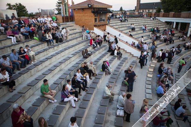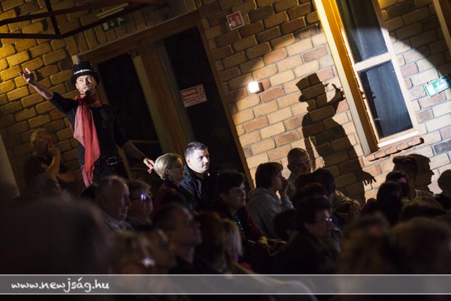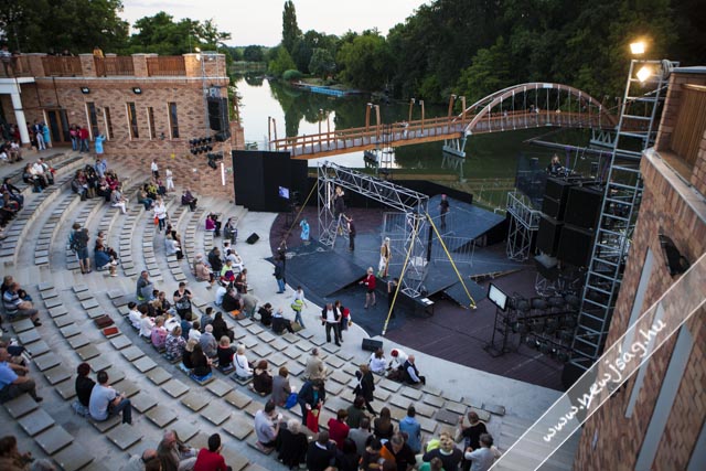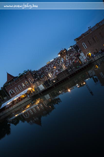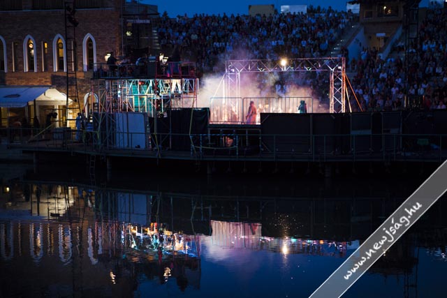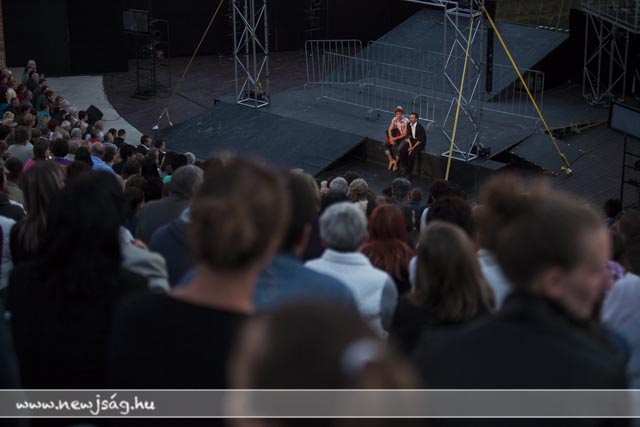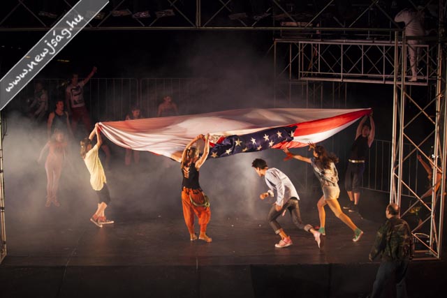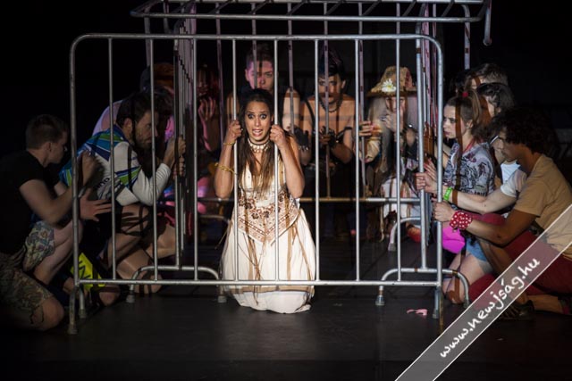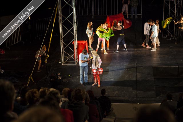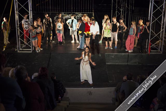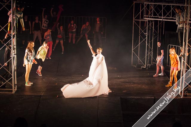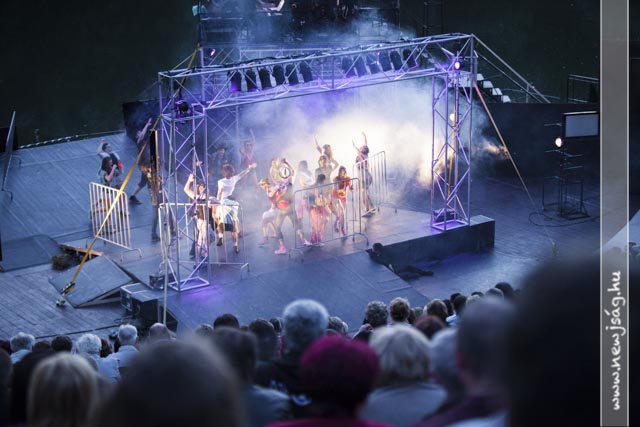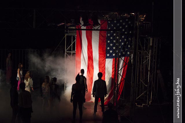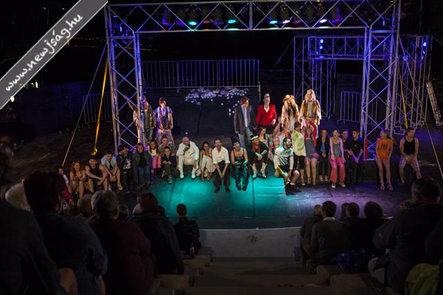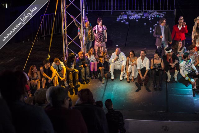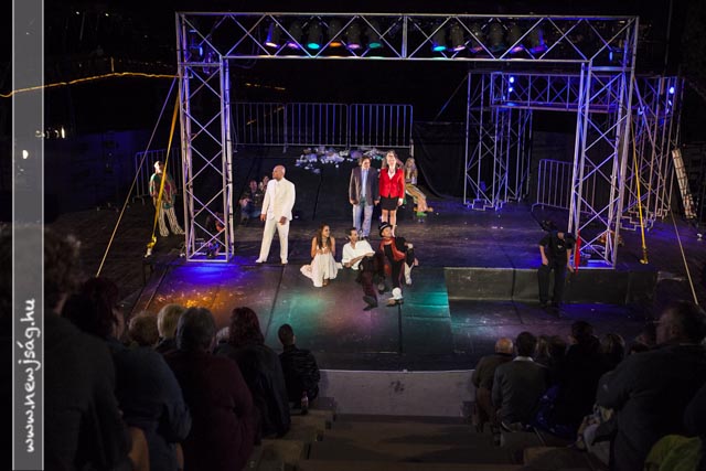 Az Egri G.G. Színház péntek esti előadásához birtokba vette nézőteret is. Nagyon ügyeltek arra, hogy a kisebb színpadkép kitáguljon, a színpad mindkét oldalán is jelenetek zajlottak és a lépcsőket is bevonták a játékba. Ezt nagyra értékeltem. Az egész színház fesztivál helyszínévé változott. A játék a két, más érték rendet valló riporter riportjaival kezdődött. Amikor beléptem a nézőtérre a „riportok” már mentek. Arra gondoltam ez egy ráhangoló, – pedig még kívül nagyon sokan várták, hogy bejöhessenek a nézőtérre – azonban ez már az előadás eleje volt. Ez az egy kifogásolni valóm volt, és ma sem értem miért kezdték el úgy, hogy a nézők egynegyede nem ült a helyén. Úgy éreztem, mintha az elejéről lemaradtam volna.