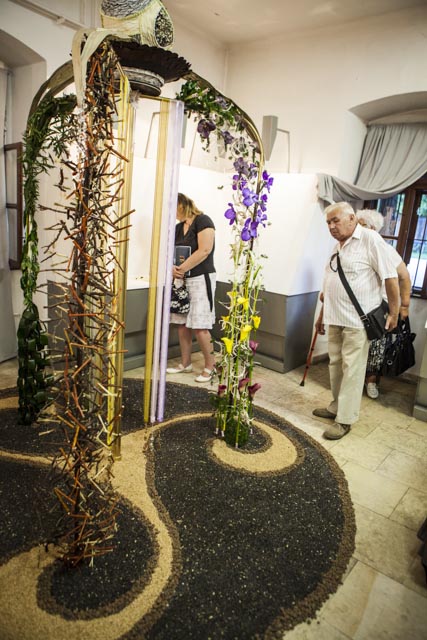 Az idén öt szarvasi virágkötő mesterekből, de inkább virágkötő művészekből álló team állította össze kompozícióit a Tessedik Sámuel Múzeum dísztermében, ahol a hőmérséklet és a páratartalom pillanatok alatt beállt a trópusi esőerdőket jellemző szintre, ami a virágoknak biztosan jót tett.