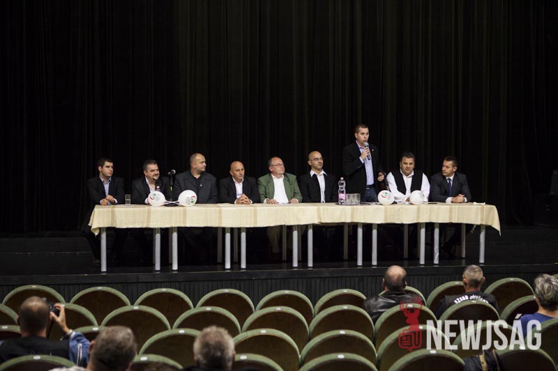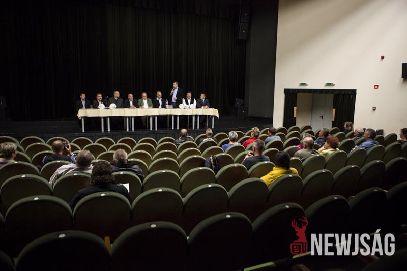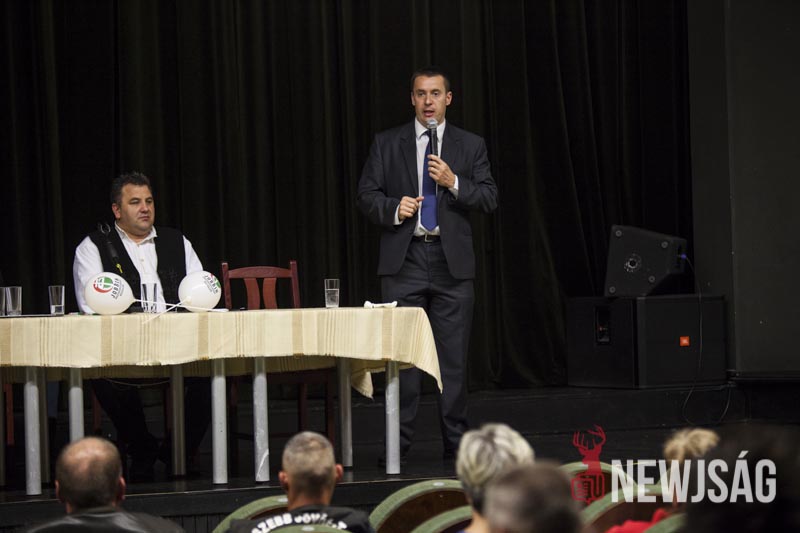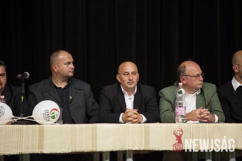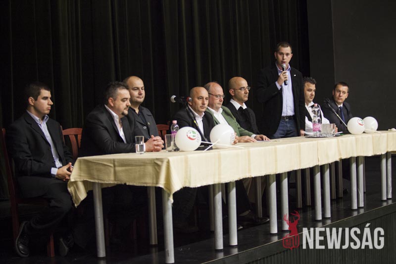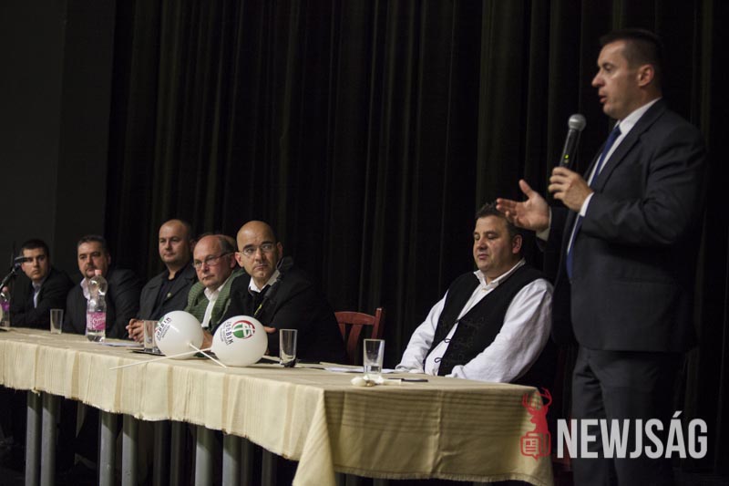 Miután Samu Tamás Gergő nagyon röviden bemutatta a színpadon az asztal mögött ülő jelölteket, és megismételte azt a kijelentését, hogy az egyetlen alternatíva a városban változást akaróknak a Jobbik, átadta a szót Gajdos Attilának, a Jobbik polgármester-jelöltjének.