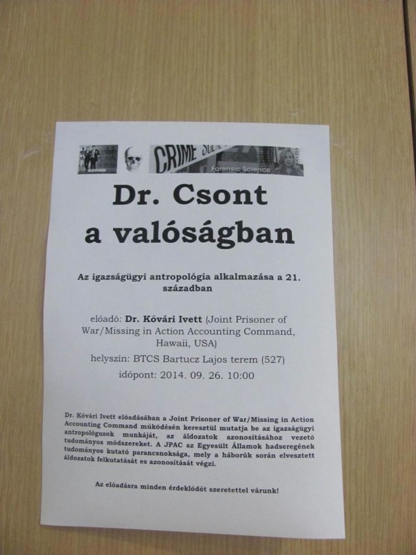 A „Dr. Csont a valóságban” című előadáson az igazságügyi antropológia gyakorlati alkalmazásába tekinthettünk be egy Hawaii-n dolgozó igazságügyi antropológus segítségével, aki bemutatta, hogyan végzik a háborúk során elvesztett áldozatok felkutatását és azonosítását.