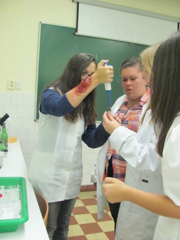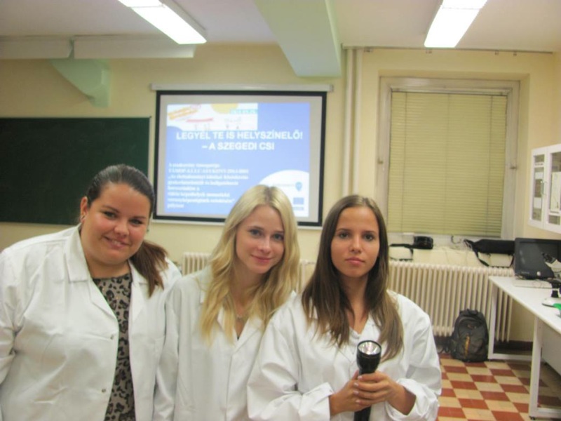 Kipróbálhattuk, milyen a helyszínelők és a laborokban dolgozó munkatársaik munkája a „Legyél te is helyszínelő” programon, ahol rövid elméleti bevezetőt tartott a Csongrád Megyei Rendőr-főkapitányság Bűnügyi Osztályának alezredese. Ezután kivonultunk a „helyszínre” és az ott talált nyomokat – vér, hajszálak – a laborban elemeztük.