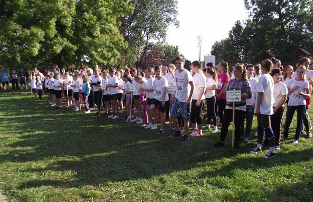 A negyedik osztályosok zenés bemelegítése után rajthoz állt a nagy létszámú csapat, majd Erzsike néni jelzése után nekiiramodtak a táv teljesítésének.