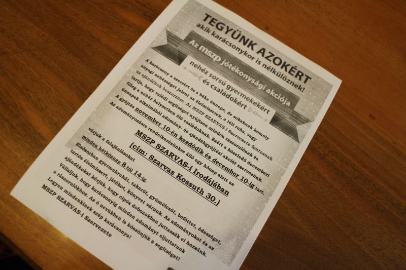 A párt helyi vezetője kitért egy jótékonysági akcióra is, amelyet az MSZP elsősorban rászoruló gyermekek, családok számára hirdetett meg. December közepéig várják a párt irodájába a felajánlásokat: elsősorban játékot, ruhát és tartós élelmiszert.