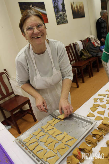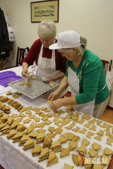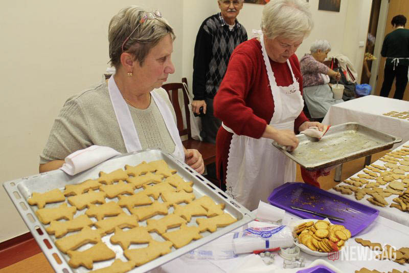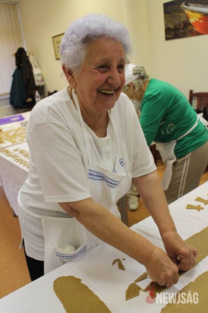 A hangulat mindvégig feledtette a fáradságos munkát. Az egyik háziasszony épp ekkor érkezett meg egy tepsi angyalka formájú mézeskaláccsal, többen pedig azt vitatták meg, hogy melyik formából kellene még sütni. Egy másik vállalkozó kedvű néni pedig a vitamin utánpótlásról gondoskodott: egy-egy mandaringerezd került mindenkinek véletlenszerűen a kezébe vagy a szájába.