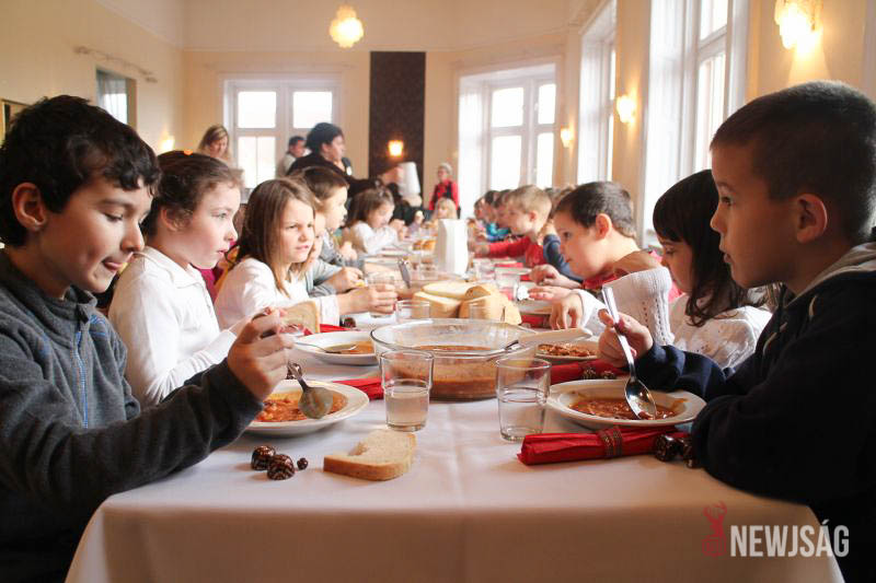 A családok babgulyásból és bejgliből álló estebédet fogyaszthattak, a kijáratnál pedig mindenkit egy-egy gondosan becsomagolt, személyre szóló ajándék várt, a Magyar Élelmiszerbank adományának köszönhetően.