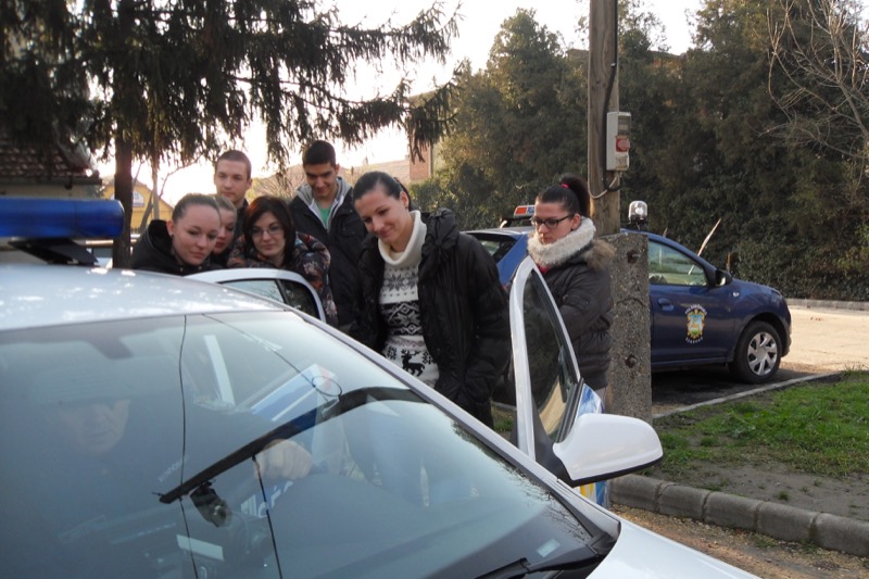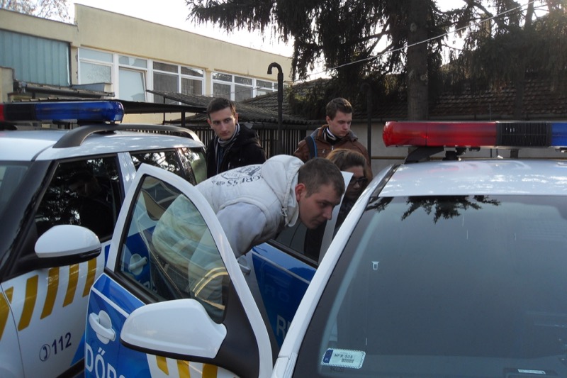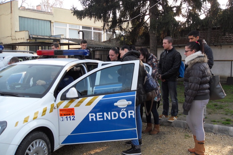 Látogatásunk végén Petruska László százados vezetésével benézhettünk a Szarvasi Rendőrkapitányság helyiségeibe, Radics Attila körzeti megbízott pedig megmutatta a rendőrautók technikai felszereltségét. Néhányan be is ültek a kék-fehér autókba.