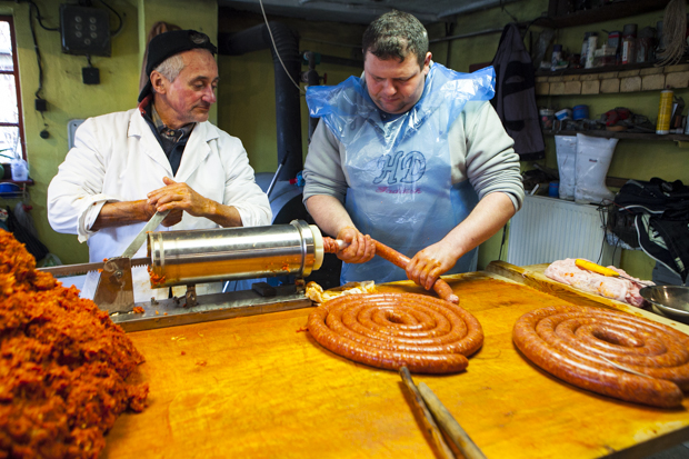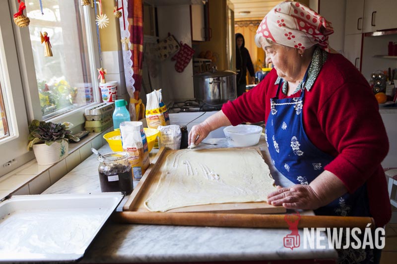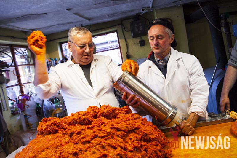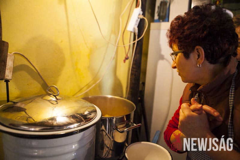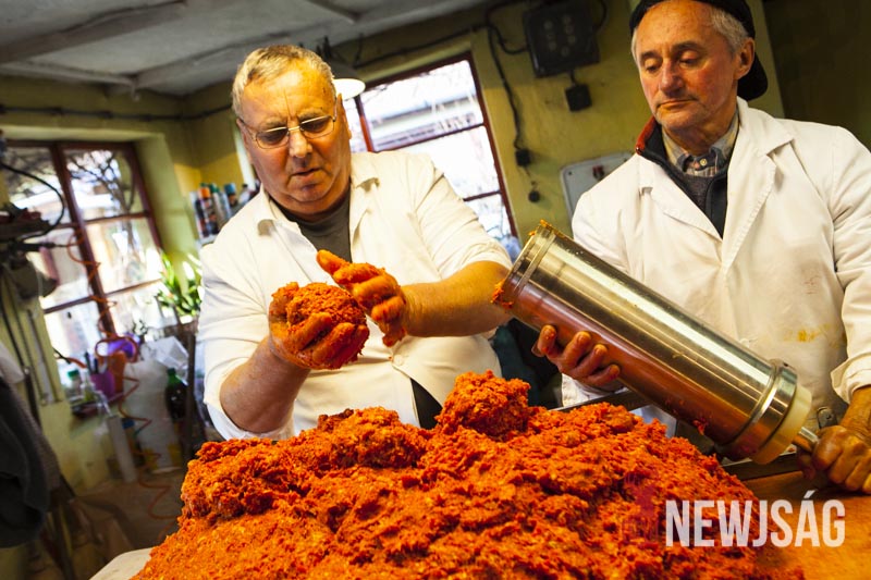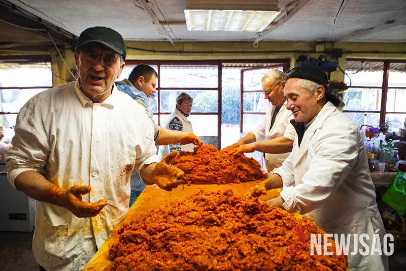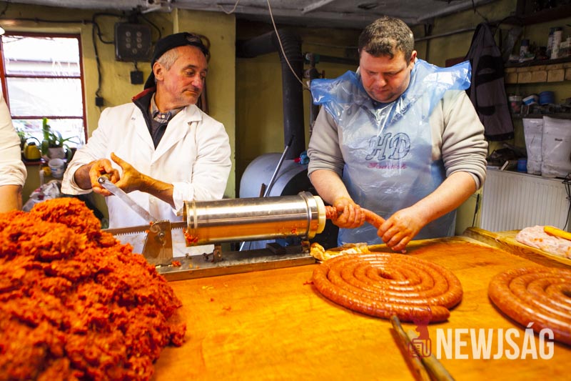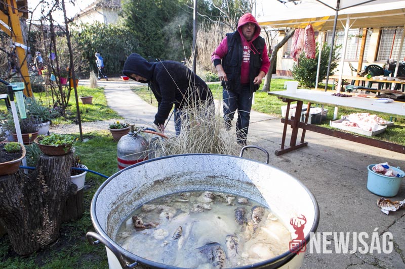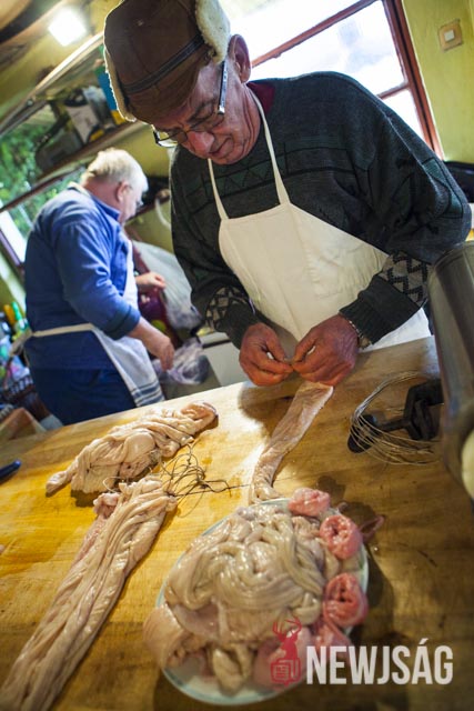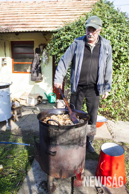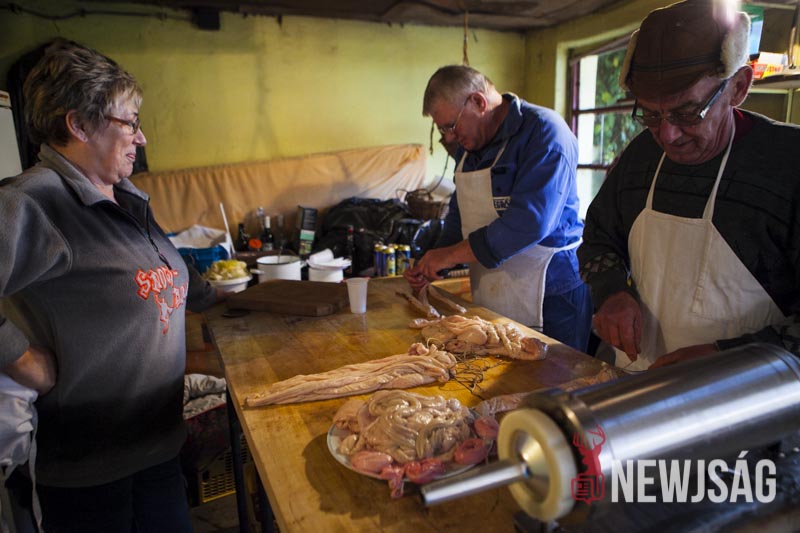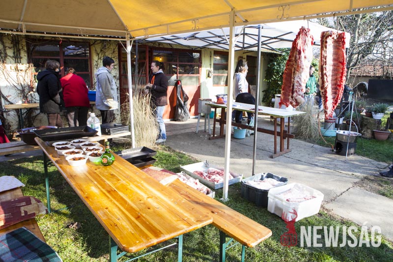 Szombaton reggel hat órakor találkozott a csabacsűdi baráti közösség, hogy közösen elmenjenek a kiszemelt sertésért, azt Varga László portájára vigyék, és elkezdjék a feldolgozását. Az udvaron egy szabadtéri kemence áll, aminek a homlokzatát az első szilveszteri vágás áldozatának, egy magyar szürkemarhának a trófeája díszíti. Ottjártunkkor, úgy dél környékén már a kolbásztöltés folyt, a zsírt lassan le lehetett venni, bent pedig hájas tészta készült.