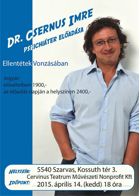 Aki pedig a nagy hahoták helyett a lélek mélységeiben szeretne elmerülni, váltson jegyet Dr. Csernus Imre előadására. A szókimondó doki ez alkalommal „Az ellentétek vonzásában” címmel rántja le a leplet a párkapcsolatok nehézségéről, de az önismeret, önszeretet és az önbizalom erősítésének módszerei is előtérbe kerülnek.