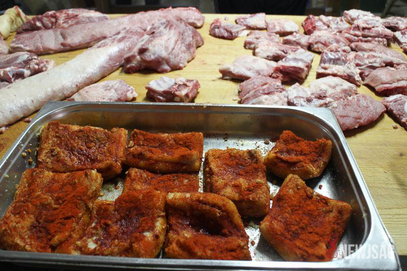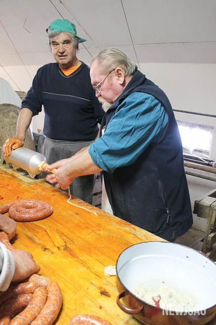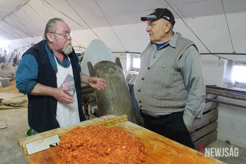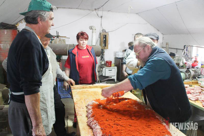 Ott jártunkkor épp a kolbász előkészítése zajlott. Kovács László böllér sóval, borssal, és köménymaggal szórta meg a frissen darált húst, amit bőségesen beterített az enyhén csípős paprikával.