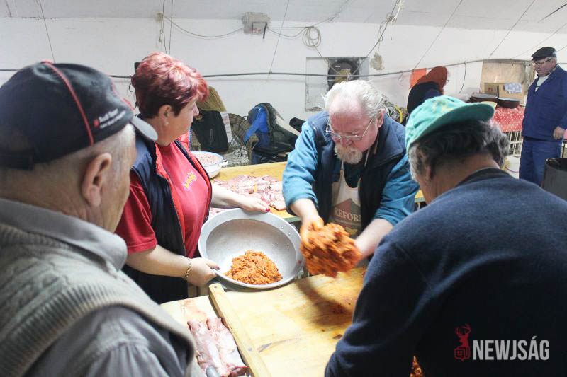 Ott jártunkkor épp a kolbász előkészítése zajlott. Kovács László böllér sóval, borssal, és köménymaggal szórta meg a frissen darált húst, amit bőségesen beterített az enyhén csípős paprikával.