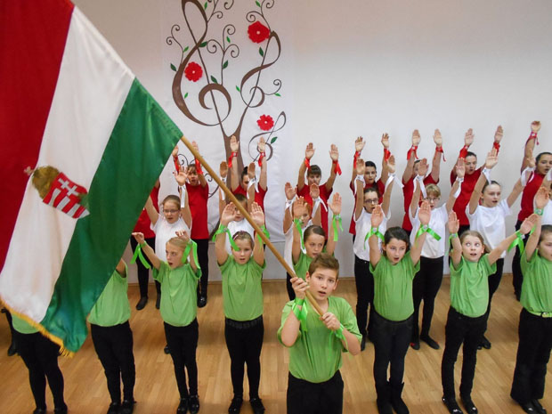 Nemzeti jelképünk tiszteletére Szilágyi Ákos, a Magyar Trikolor Kft és az ’56 Lángja Alapítvány 2006 óta fotópályázatot hirdet „A Trikolór tizenkét hónapja” címmel, s e fotókból évről évre falinaptárt állít össze. Az évenként megújuló naptár mellé 2013-ban dal is született, melynek zenéjét Szikora Róbert írta. Akkor a dal bemutatására 11 híres magyar előadóművészt kértek fel, idén pedig ennek a Lobogó dalnak feldolgozására hirdettek pályázatot. Iskolánk oktató-nevelő munkájában nagy hangsúlyt fektetünk a nemzeti identitástudat kialakítására és fejlesztésére, így a hozzánk is megérkező felhívást elolvasva és a dalt meghallgatva úgy gondoltuk, új szemszögből tovább erősíthetjük diákjaink lelkében és gondolataiban nemzeti szimbólumaink felé való tiszteletadásukat, lobogónk és címerünk megbecsülését. Énekkaros diákjainkkal a dal megtanulása mellett párhuzamosan heteken belül megkezdtük a szöveg mozgással való kifejezésének begyakorlását is, hogy március 1-re – ahogyan a kiírásban kérték- be tudjuk küldeni a videofelvételt. Igazi csapatmunkával oldottuk meg a feladatot, a hátteret egyik diákunk tervezte, kollégánk kivitelezte, a mozgás kitalálásában szintén kaptunk segítőtársat és ami a legfontosabb, hogy iskolánk vezetősége teljes mértékben támogatta törekvésünket. Az elkészült munka után pedig vártuk, milyen eredmény fog születni, tetszik-e másnak is az, amibe mi a szívünket, lelkünket beletettük. Hihetetlen volt az a pillanat, mikor telefonon keresztül megkaptam a hírt, hogy a pályázatot megnyertük. Szavakba nem lehet önteni, diákjaink mit éreztek akkor, csak én éreztem az ölelésükből és láttam a szemeikben. Azt pedig, hogy eljutottunk a gálára március 16-án, hétfőn este és a színpadon be is mutattuk a közönségnek, nemcsak számukra nyújtott életre szóló élményt, hanem minden embernek, aki ezen az ünnepi esten megjelent, beleértve igazgatóasszonyunkat, kollégáimat és magamat. Azt a lelkes éneklést, amit diákjaink szájából hallhattunk, átérezve annak minden szavát, a dal végén kitörő hatalmas taps és sok gratuláció viszonozta. Eltelt két nap, s ha rágondolok, könnyek, örömkönnyek futnak a szemembe, tudva, hogy valamit adtunk a diákjainknak, ami lehet és remélem, hogy mély nyomot hagyott bennük.