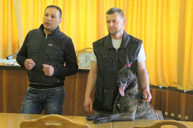 A tájékoztatót rövid időn belül szokatlan csaholás és a hivatali közegtől meglehetősen idegen hangok szakították meg. A Szarvasi Kutyakiképző Iskola segítői érkeztek, négylábúak kíséretében. A kutyusok előbb több-kevesebb türelemmel hallgatták a beszámolót, majd egy rögtönzött bemutató formájában maguk is kivették a részüket az eseményből.
