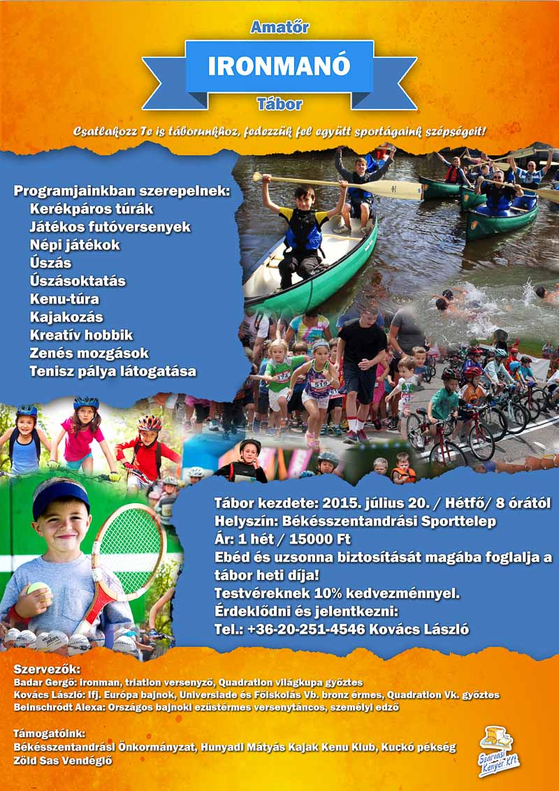 Így Badar Gergő barátommal úgy döntöttünk, az idei évben életre hívjuk az első amatőr ironmanó napközit. Többen mondták, hogy talán már kissé késő van egy tábor meghirdetéséhez, mégis úgy hiszem ez sem lehetetlen. A gyerekek elsajátíthatnák sportágaink alapjait, akik haladóbb szinten mozognak, azok belekóstolhatnak egy kicsit az edzések világába is. Nem bajnokokat keresünk, csak lehetőséget kívánunk biztosítani egy egészséges aktív élethez. Mindketten a Szegedi Tudomány Egyetem hallgatói voltunk, Gergő, mint testnevelő-edző végzet. Én, mint egészségfejlesztő és rekreációs szakember fogok végezni. Emellett mindketten rendelkezünk sportoktatói végzettséggel, sportágaink oktatásához szükséges edzői oklevéllel. Fontos tudnivaló, hogy nem csak fiúk jelentkezését várjuk. Bátran jelentkezhetnek lányok is. Csapatunkhoz csatlakozott a párom. Ő társas táncolt évekig, jelenleg személyi edzősködik, alakformáló edzéseket tart és ismerkedik a triatlonnal. Azt már biztosan tudom, hogy Alexa fogja tartani a reggeli zenés gimnasztikát a gyerekeknek. Most jelentkezett a szarvasi óvónőképző főiskolára. Az esetleges problémákban nagy segítség lesz az Ő személye, így már a lányos dolgoknak is van szakértője a mi kis csapatunkban.
