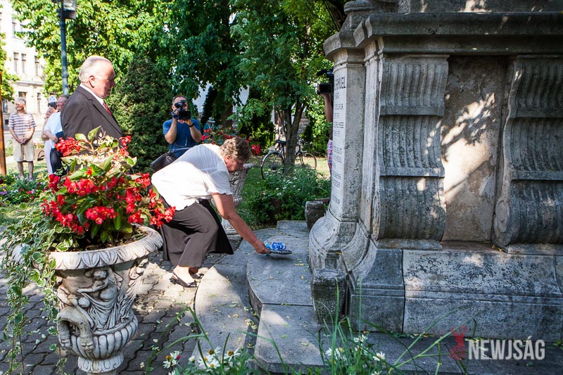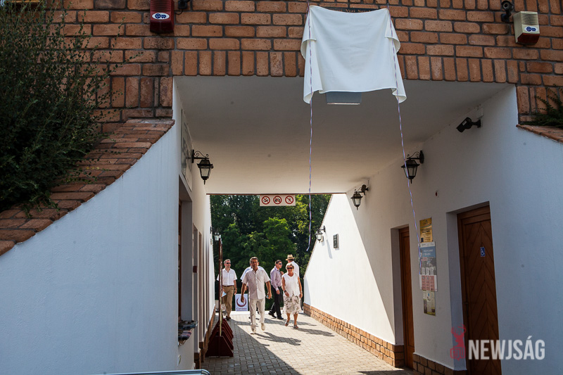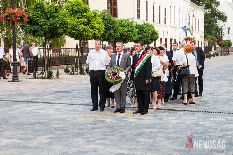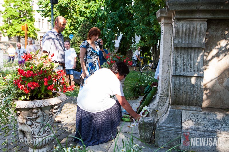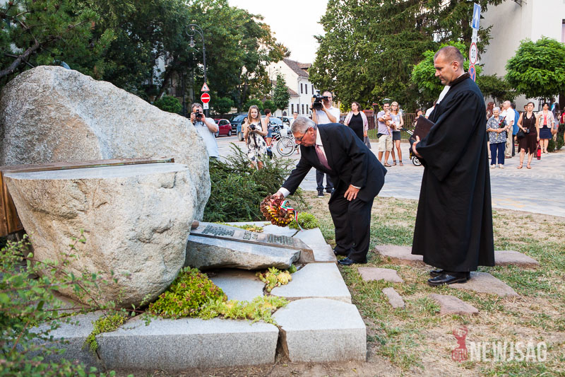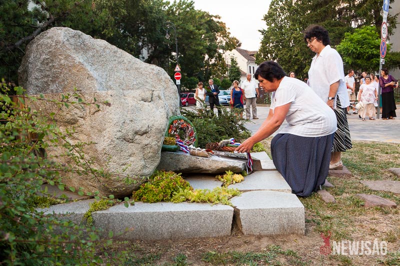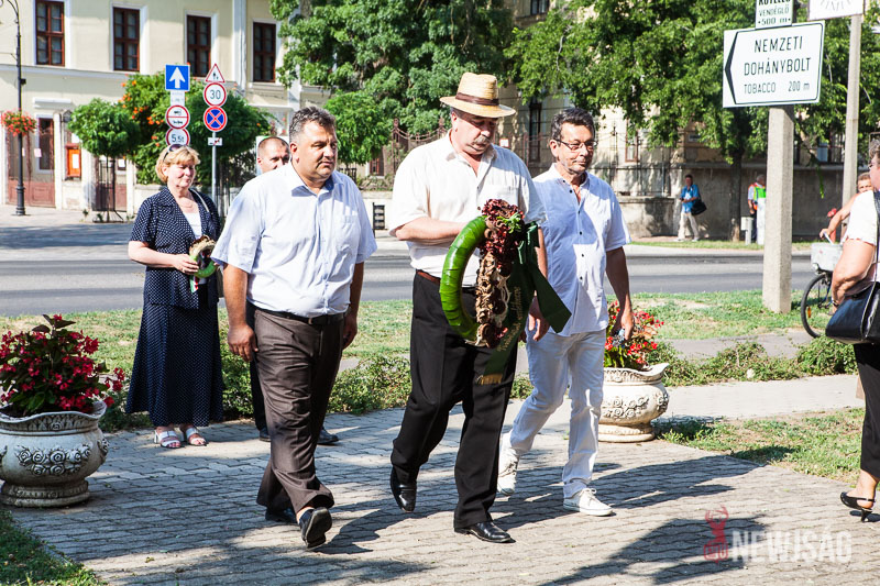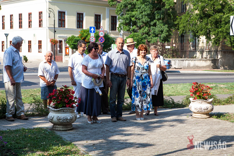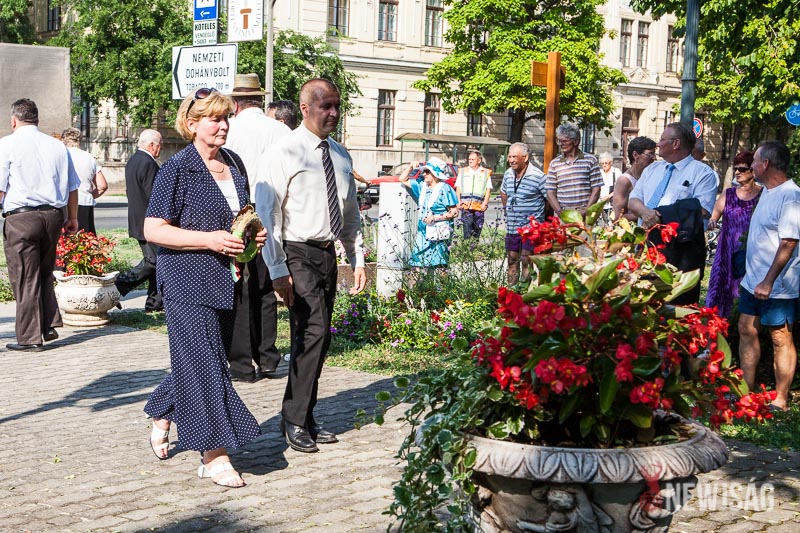 A ceremónia után az ünneplő tömeg a Letelepedési emlékműhöz vonult, hogy itt is elhelyezze a hála koszorúit, amit a kamionok résein Tessedik is szemmel követhetett.