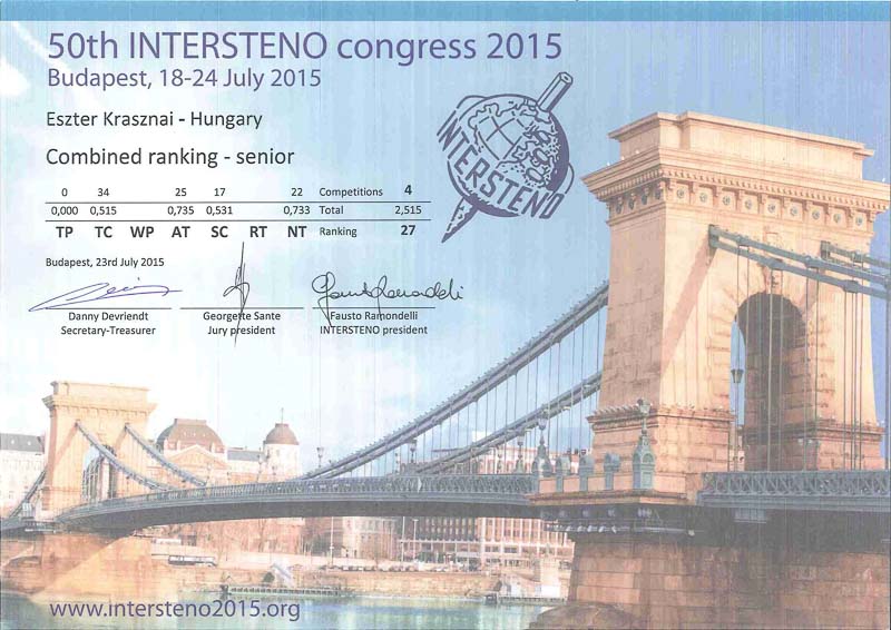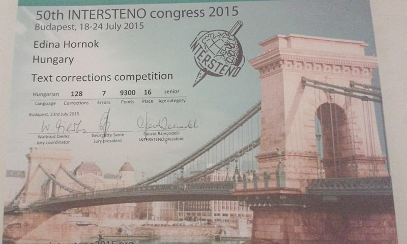 Hornok Edina – többszörös magyar bajnok szövegszerkesztő – a nemzetközi mezőnyben is becsülettel helytállt. A szoros mezőnyben a 16. helyen végzett (83 induló között), ezzel a magyarok közül a legjobb teljesítményt nyújtotta. Edina gépírásból is nagyszerűen teljesített, a középmezőnyben végzett. Egy különleges meglepetésben is része volt, az Council vacsorán az Intersteno vezetősége felköszöntötte születésnapja alkalmából.