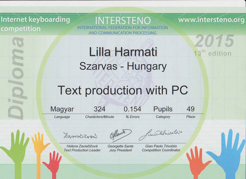 Harmati Lilla csupán 2 éve tanulja a gépírást (hiszen még csak 14 éves), és máris kiemelkedő teljesítményt nyújtott az országos versenyeken. Részt vett a nemzetközi internetes gépíróversenyen is, ahol 1700 versenyző között a 398. helyen végzett, saját korosztályában (13-16 évesek) pedig 49. lett (420 résztvevő), ezzel a magyar résztvevők között a 2. legjobb teljesítményt nyújtotta. Mivel a magyar versenyeken is bizonyította tudását, ezért lehetőséget kapott arra, hogy részt vegyen a világbajnokságon is. Jó volt látni Lillát – a jövő reménységét – a Corvinus Egyetem aulájában 120 különböző nemzetiségű versenyző között. Felkészítő tanára, édesanyja, Harmati Ágnes a helyszínen kísérte figyelemmel a világbajnokság menetét, részt vett a regisztrációs pultban folyó munkában is.