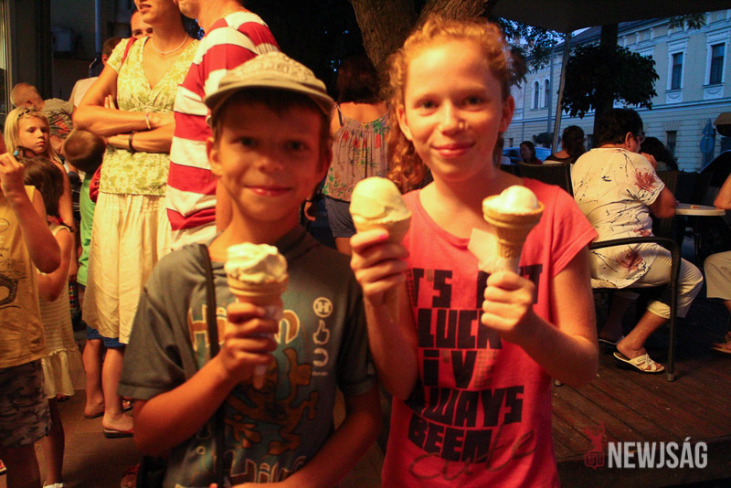 – Kondorosról jöttünk át kilencen, kizárólag az akció kedvéért – újságolja egy több gyermekes édesanya, miközben épp a háromgombócos finomságot eszegeti. Ma este úgy döntöttünk, mindenki egy-két adaggal többet megengedhet magának, de még az extra tölcsér is belefér.