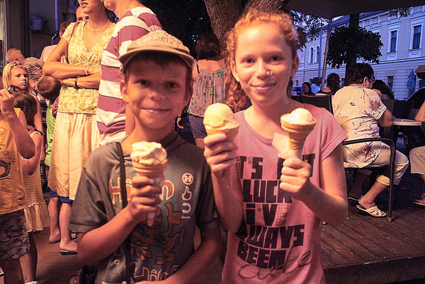 – Kondorosról jöttünk át kilencen, kizárólag az akció kedvéért – újságolja egy több gyermekes édesanya, miközben épp a háromgombócos finomságot eszegeti. Ma este úgy döntöttünk, mindenki egy-két adaggal többet megengedhet magának, de még az extra tölcsér is belefér.