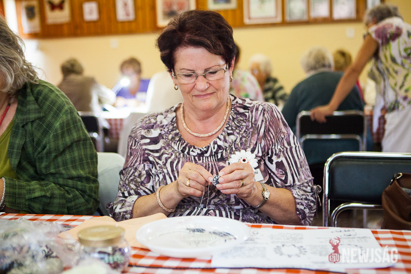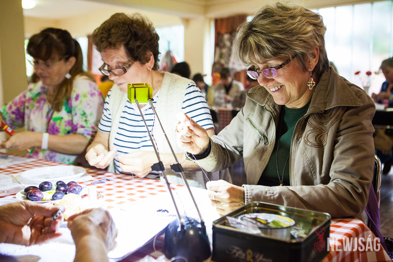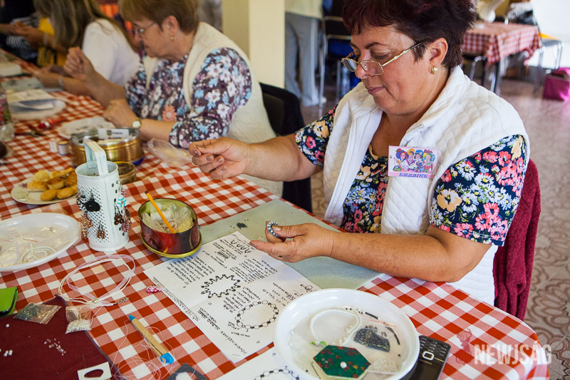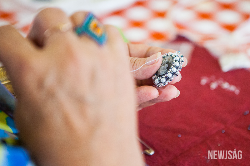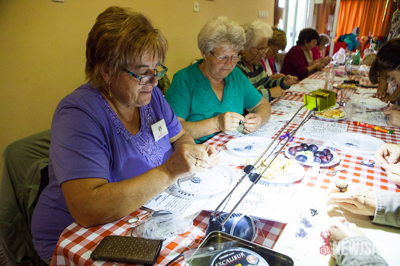 – Az idén a gyöngyfűzés a téma – árulta el Kuruczné Terike, a szarvasi Gobelin Hímző és Kézimunkaszakkör vezetője. – Egy karkötőt, egy nyakláncot, fülbevalót és gyűrűt készítünk. Kezdő és haladószintű feladatok vannak, így ki-ki képességei szerint végezheti a gyakorlatokat. A technika iránt érdeklődők teljesen nulláról is indulhatnak, tehát semmiféle alapképzettség nem szükséges. Ha nem is csinált eddig semmilyen komolyabb dolgot, akkor is minden további nélkül meg tudja csinálni. Most ott tartunk, hogy a medál már készen van. Ez az alapszint. A kezdő és a haladó szint inkább technikában különbözik. A kezdőknek egyszerűbb, a haladóknak bonyolultabb fűzési technikát adott gyakorlat vezetője.