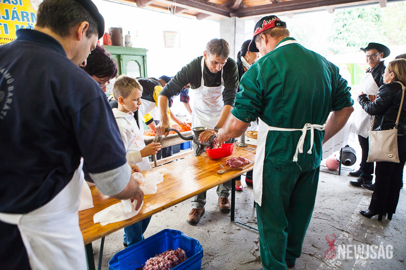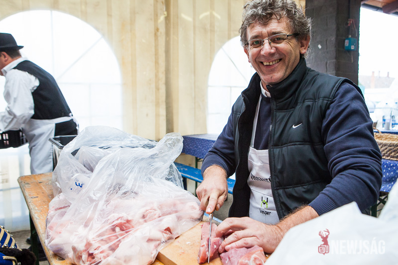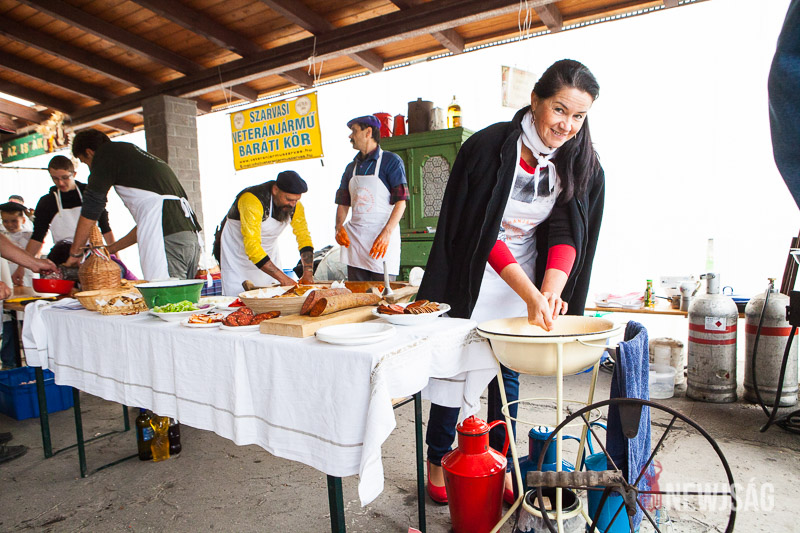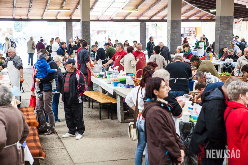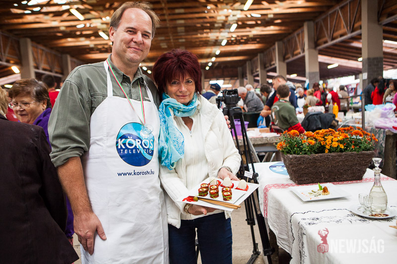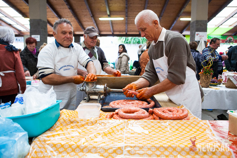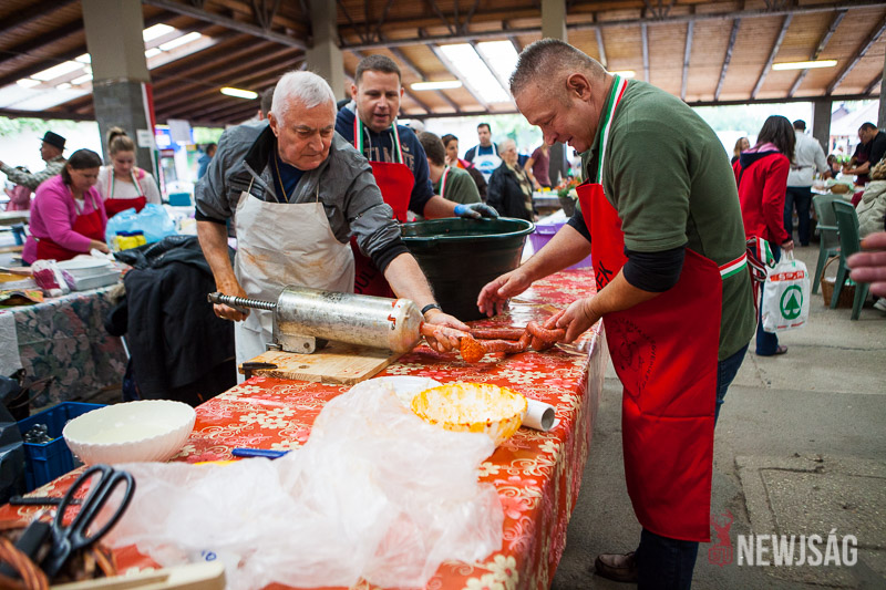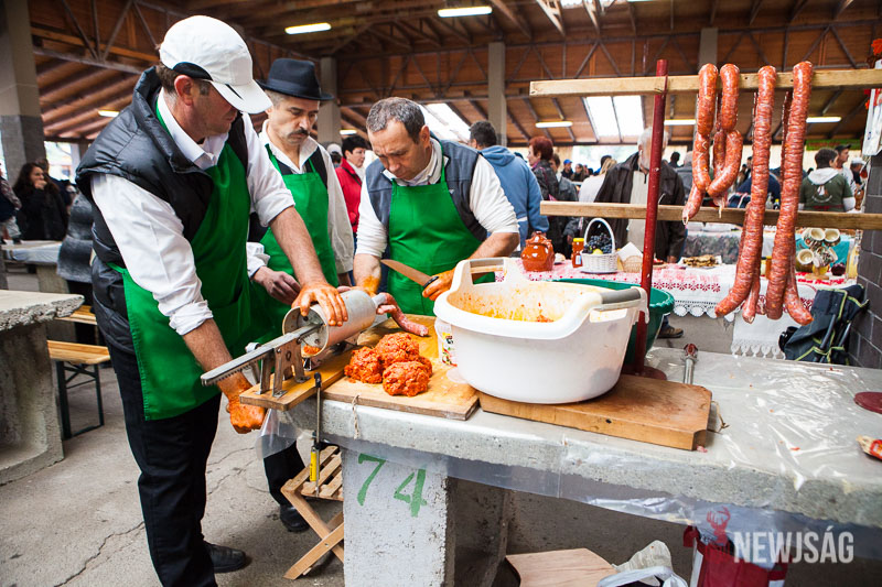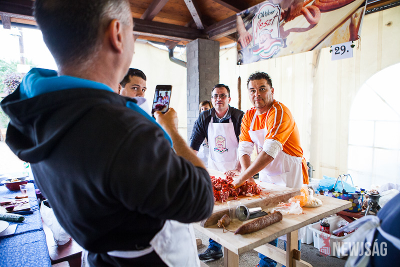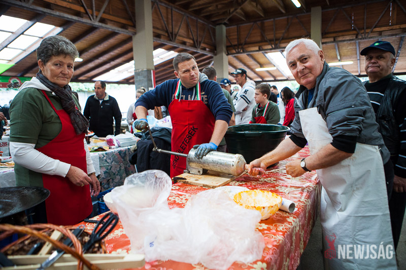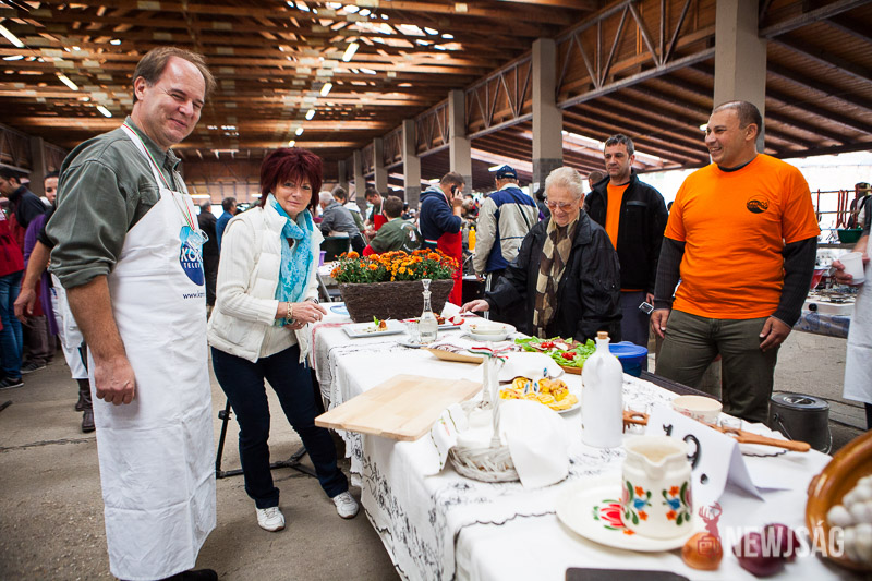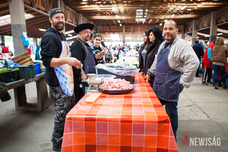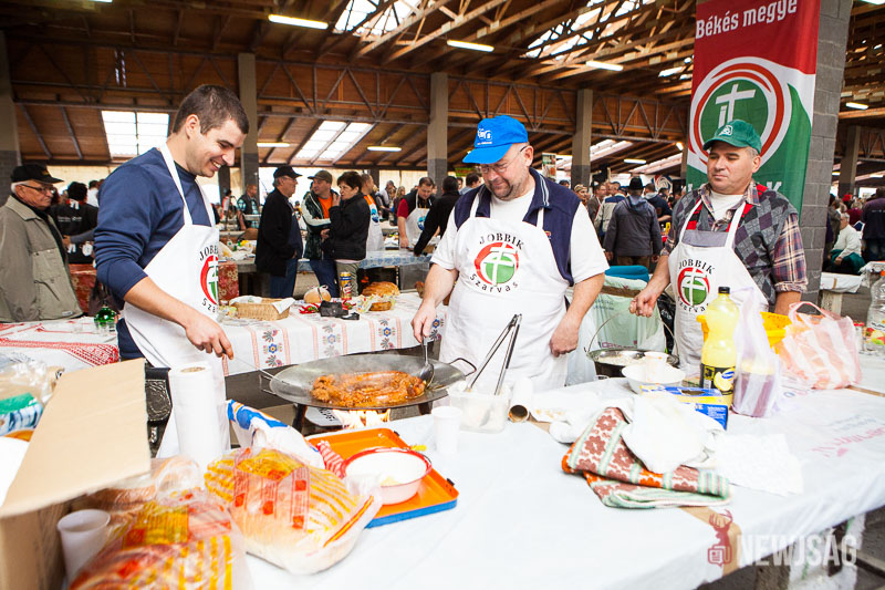 Kilencedik alkalommal rendezte meg Szarvasi Gazdák Nemzetiségi Hagyományőrző Egyesülete az idénynyitó disznótort Szarvason. Az esemény az időjárás szeszélyeit semlegesítő otthonra talált az évek során a fedett piaccsarnokban. Az óvatosságnak az idén is helye volt, mert októbernek megfelelő hőmérséklet mellett lógott az eső lába. Az időjós is arra figyelmeztetett, hogy a délutáni eső a jövő héten áll el. Ebben szerencsére egy félnapnyit tévedett, de az elázásra nem is az eső jelenti az elsődleges kockázati tényezőt egy ilyen rendezvényen, hanem a fogópálinka. Abból pedig volt bőven, ugyanis a töltött káposzta főző és kolbászkészítő verseny kísérőiként csapatok megmérettetik magukat a disznótoros süteményekkel és a pálinkáikkal is.
