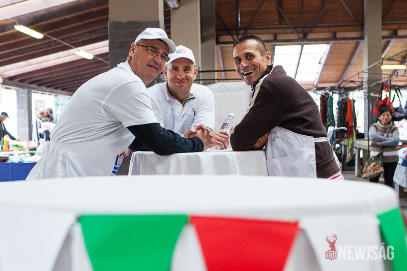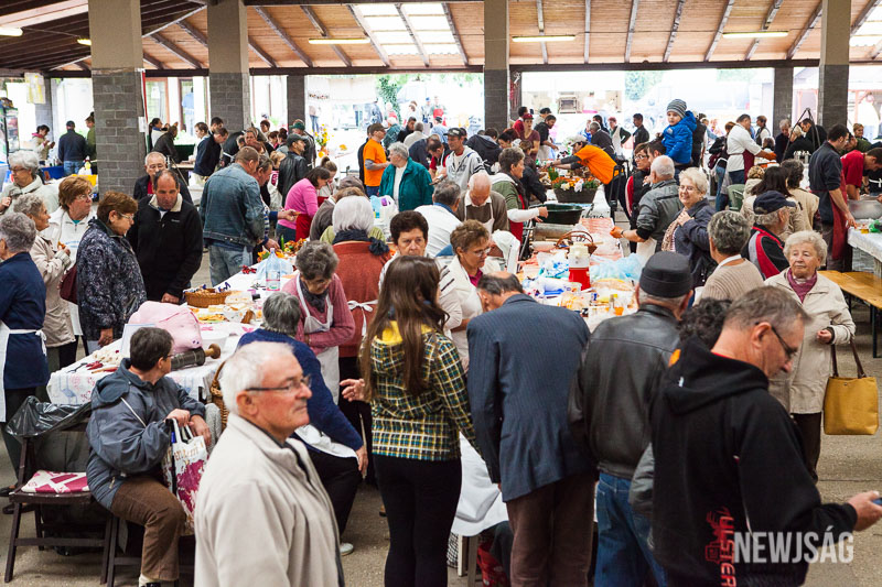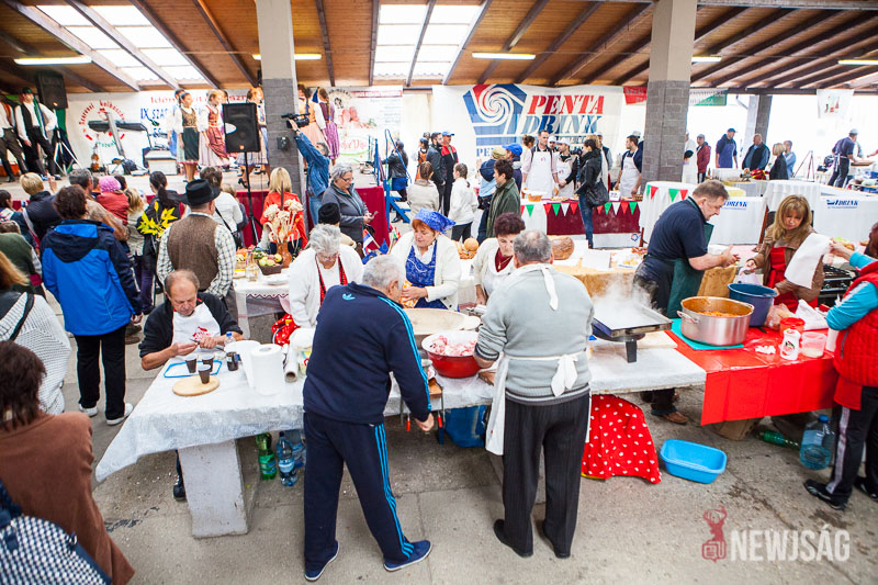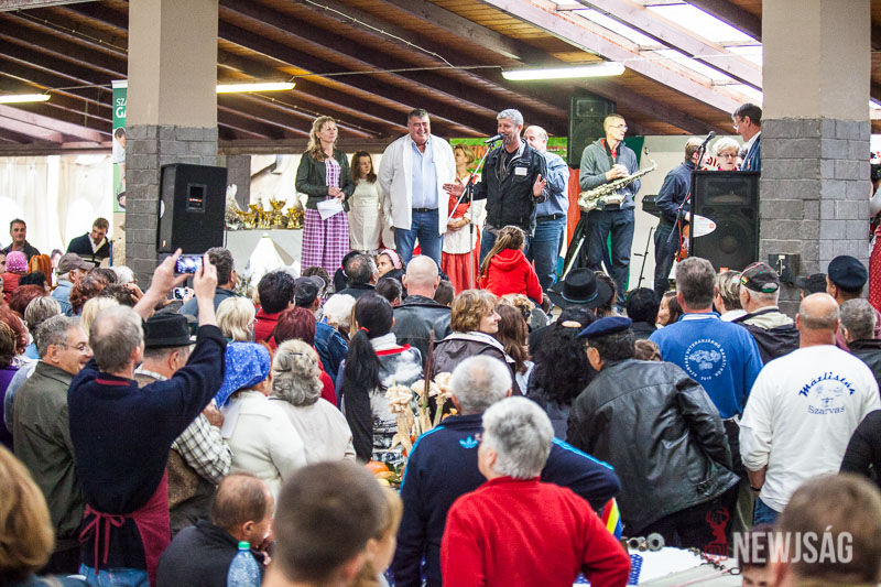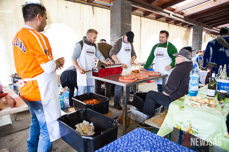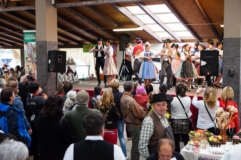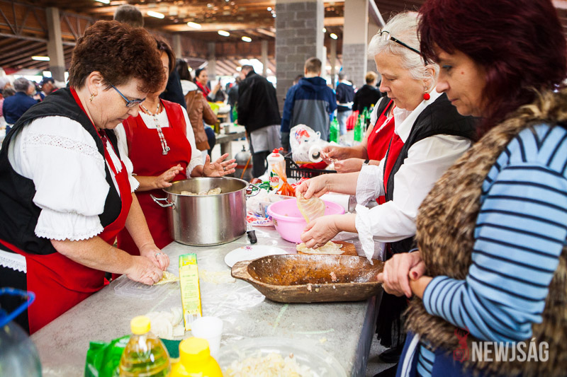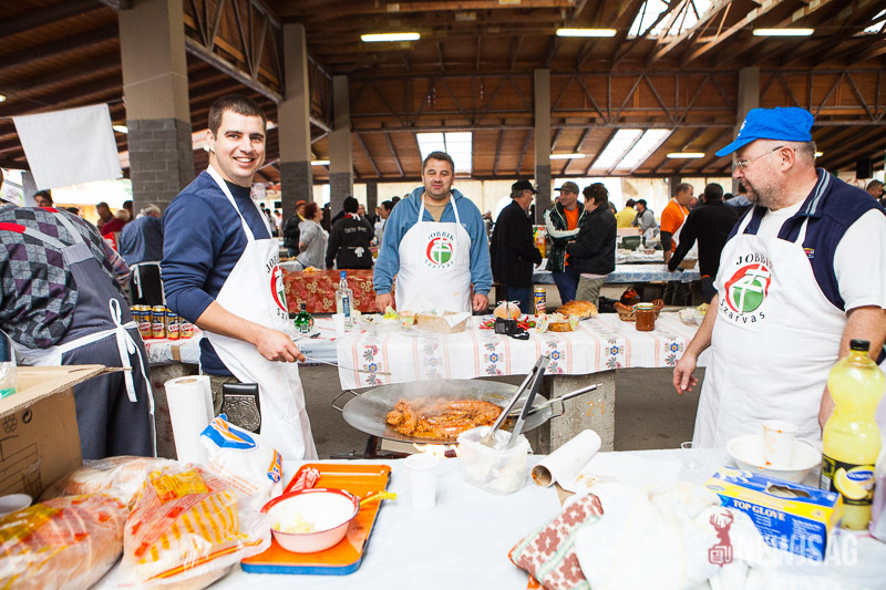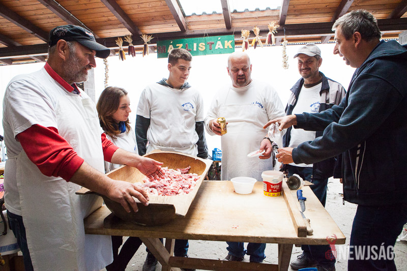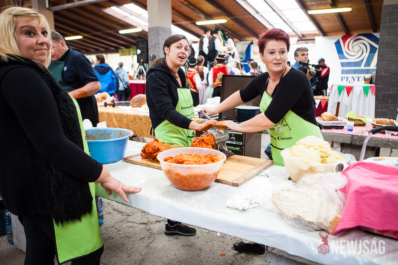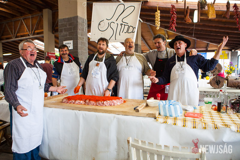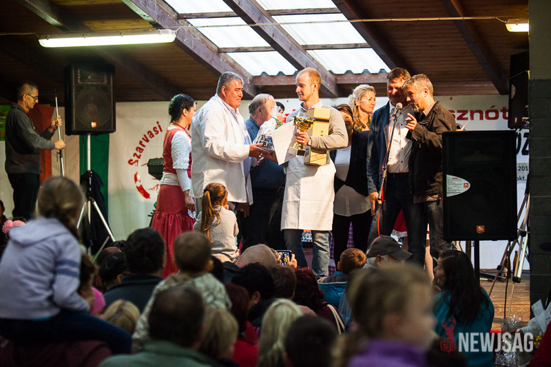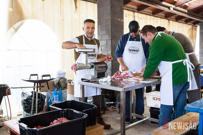 Kilencedik alkalommal rendezte meg Szarvasi Gazdák Nemzetiségi Hagyományőrző Egyesülete az idénynyitó disznótort Szarvason. Az esemény az időjárás szeszélyeit semlegesítő otthonra talált az évek során a fedett piaccsarnokban. Az óvatosságnak az idén is helye volt, mert októbernek megfelelő hőmérséklet mellett lógott az eső lába. Az időjós is arra figyelmeztetett, hogy a délutáni eső a jövő héten áll el. Ebben szerencsére egy félnapnyit tévedett, de az elázásra nem is az eső jelenti az elsődleges kockázati tényezőt egy ilyen rendezvényen, hanem a fogópálinka. Abból pedig volt bőven, ugyanis a töltött káposzta főző és kolbászkészítő verseny kísérőiként csapatok megmérettetik magukat a disznótoros süteményekkel és a pálinkáikkal is.