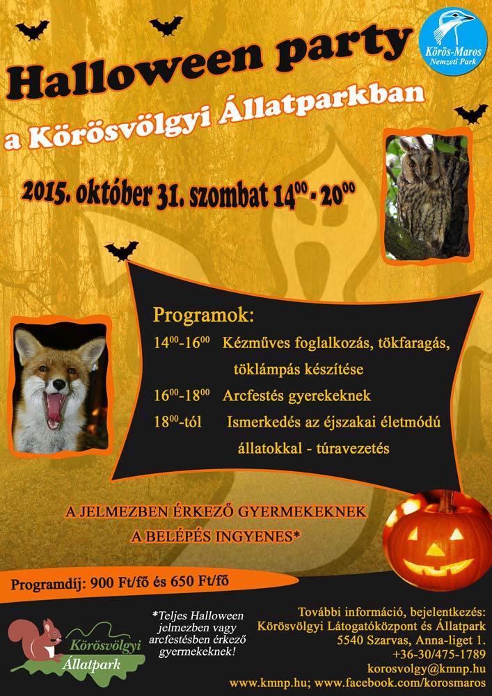 Ezen a napon hosszabban, este 20 óráig tart majd nyitva a Körösvölgyi Látogatóközpont és Állatpark. 14 órakor kezdődnek a kézműves programok, 16 órától arcfestésért lehet majd sorbaállni, 18 órakor pedig indul az esti túra az Állatparkba. A jelmezben érkező gyermekek számára a belépés ingyenes lesz.
