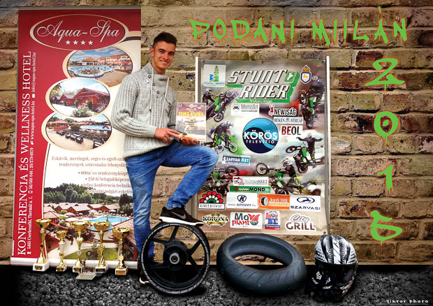 2015. november 14-én a domonyvölgyi Lázár Lovaspark exkluzív környezetében rendezte meg a Magyar Motorsport Szövetség idényzáró ünnepségét igazolt versenyzőinek. A látványos betétműsorokkal is színesített díjátadón a bőséges svéd asztalos vendéglátás mellet az idénybeli ellenfelek barátian, jó hangulatban elevenítették fel a bajnokság korábbi izgalmait. Városunkat stunt riding (akrobatikus motorozás) kategóriában Podani Milán junior versenyző képviselte. Milán az egész idényben kemény erőnléti és kitartó motoros edzésmunkával időnként még a technikai problémákkal is megküzdve eredményesen zárta az idényt. Gurult egy keréken, motorozott háttal, egyenesen és forgásban, olykor még fejen állva is. Az ünnepségen a dobogó legfelső fokára szólították, az országos ranglista junior kategória összetett versenyeiben első helyezést ért el. Gratulálunk a szép eredményhez!