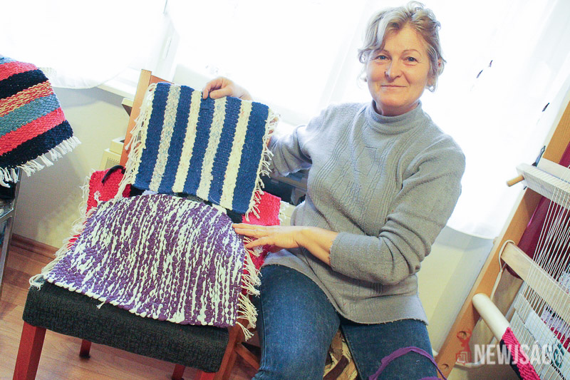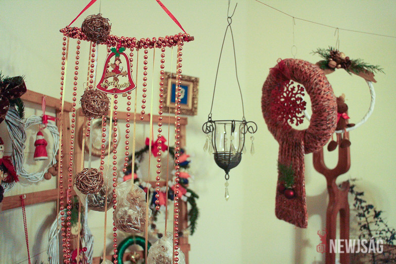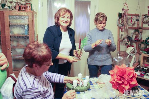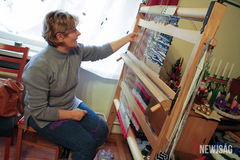 Az alkotó közösség minden talpalatnyi helyet kihasznált az elkészült tárgyak elhelyezésére. A hátsó kis asztalka pl. már zsúfolásig telt horgolt kincsekkel, ajándékötletekkel, de itt kapott helyet négy pezsgősüveg is, amelyek összeragasztva, színes szalagokkal átkötve és egy-egy gyertyával kiegészítve máris különleges adventi koszorúként funkcionáltak. Néhány méterrel odébb egy kifejezetten erre az alkalomra kölcsönkért szövőszékbe botlottunk, mögötte pedig éppen Győző Jánosné Zsuzsi rótta a sorokat.