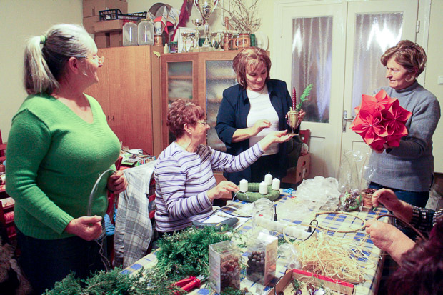 A csapat lelke Koltai Lajosné Rózsika néni, akinek egész évben ott lebeg a gondolataiban az ünnep. Év végére ugyanis mindig legalább 150 apró, horgolt díszt varázsol elő a tarsolyából, köztük mindig új ötletekkel. Idén pl. az esernyőt és a gyertyatartót is felvette a repertoárjába, amellett, hogy maradtak az örök klasszikusok: a csillagok, harangok és az angyalkák.