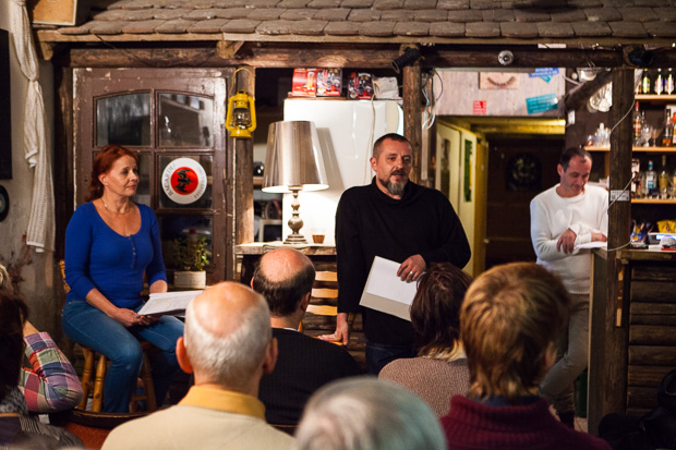 Vasárnap este a Romkocsmában Scwajda György – 1981-ben írt – Himnusz című komédiáját választotta Benkő Géza a Cervinus Teátrum felolvasóestjére, amely ezúttal is zsúfolásig megtelt. Az egyfelvonásos – bár komédia –, mégis drámailag hatott a közönségre. Benkő Géza úgy döntött két felvonásban olvassák fel, és jól tette, mert a szünetben időt hagyott a nézőknek elmélkedésre, akik az első felvonásban még nevettek a poénokon, a másodikban azonban megérezve a mondanivaló súlyát, kevesebb mosolyt csalt az arcokra, pedig a hangnem, a szöveg stílusa nem változott.