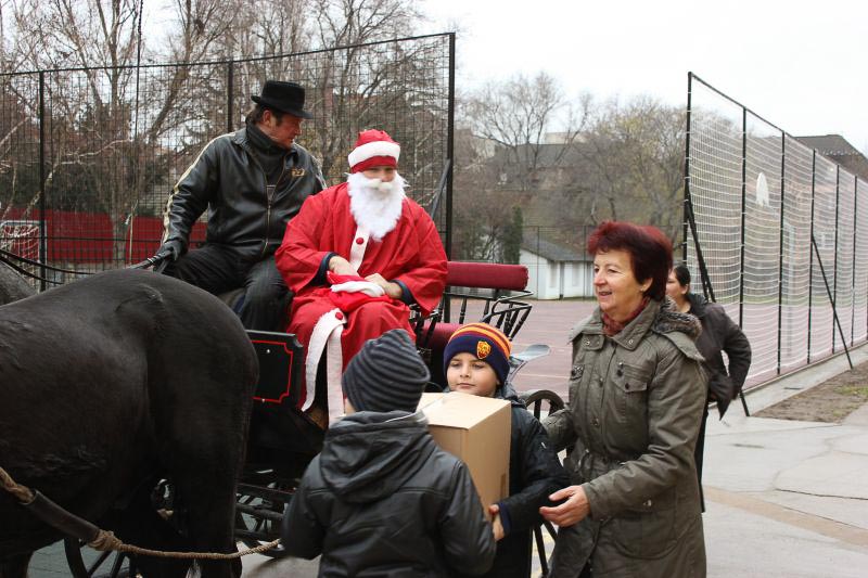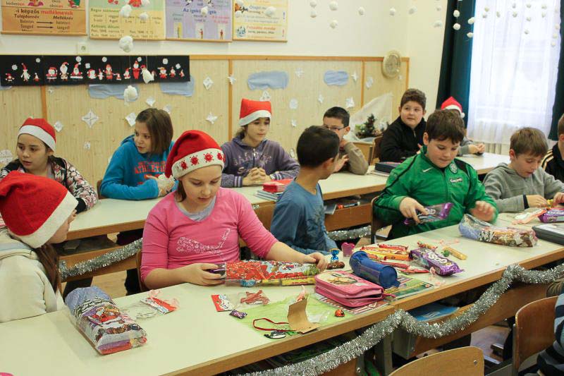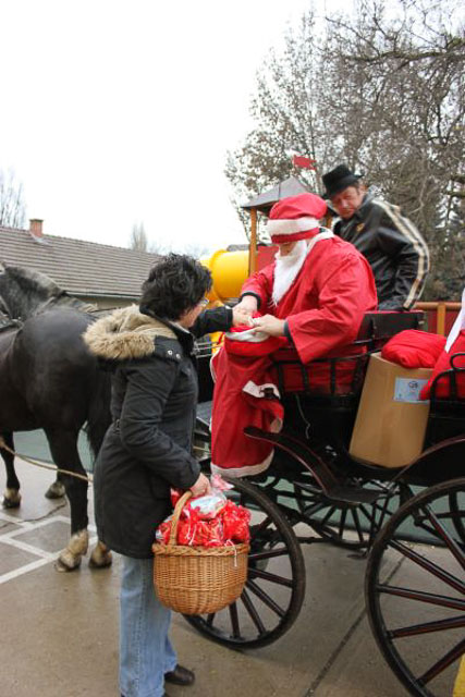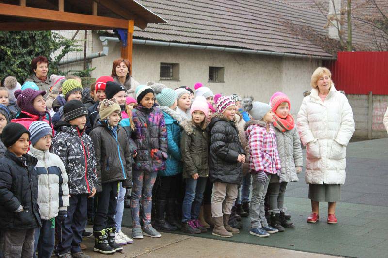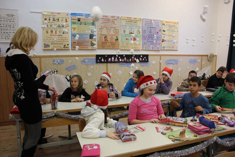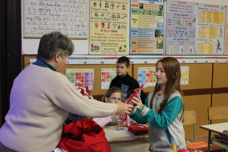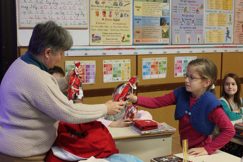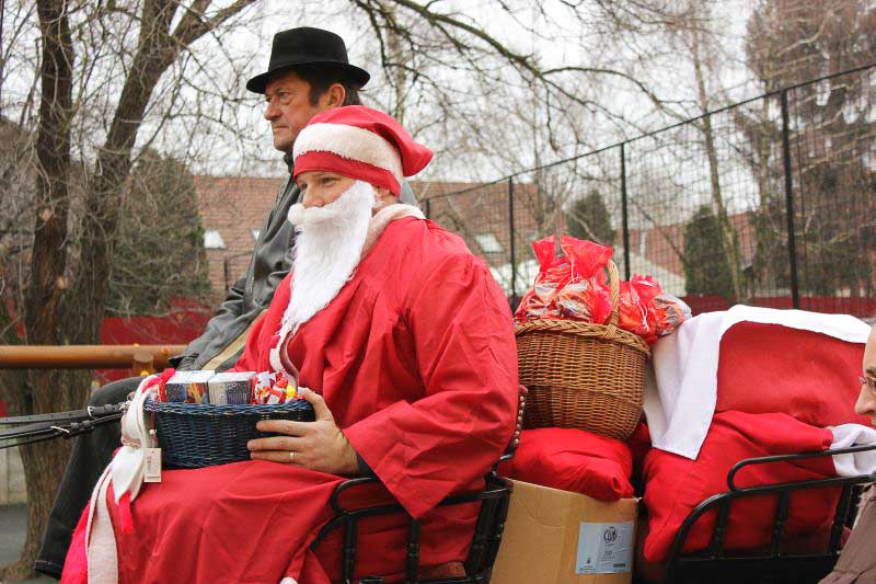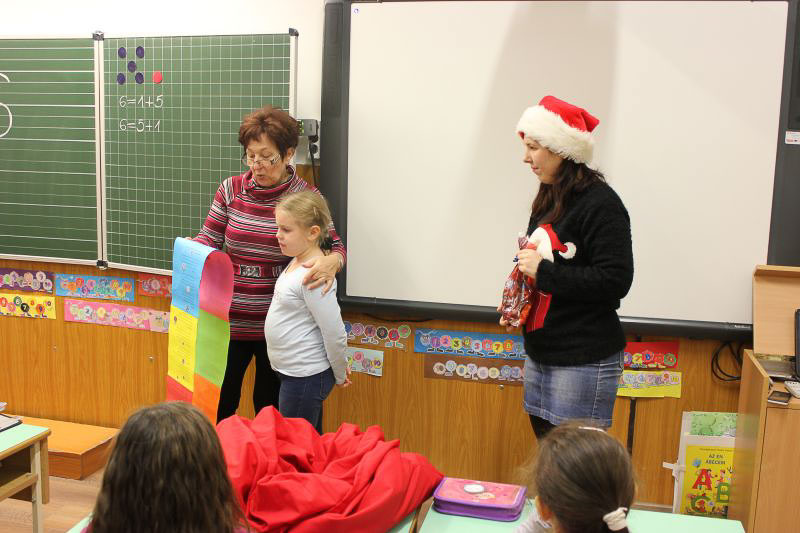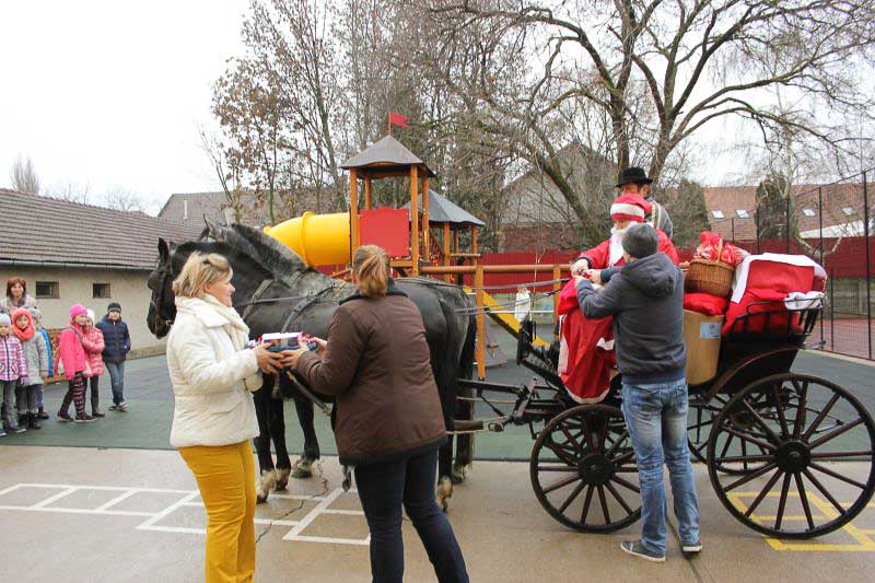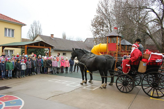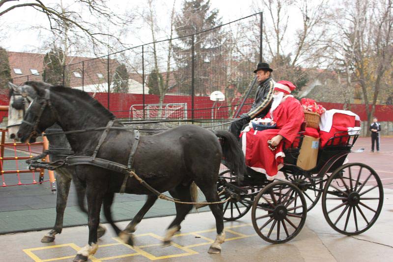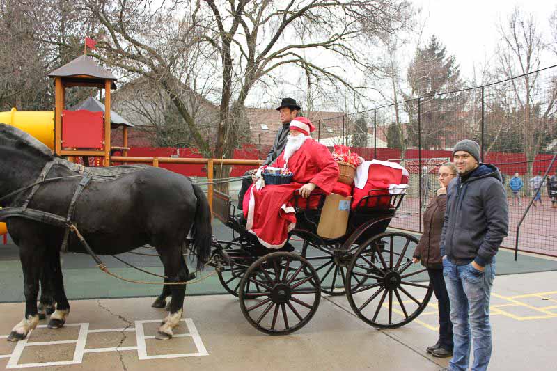 December 7-én ugyanúgy készültek az osztályok az első szünetben az udvarra, mint máskor. Mégis valami izgalom futott végig mindenkin, mert nem lehetett elfoglalni a játszóteret, rendezett sorokban kellett maradnia a gyerekeknek. Elkezdődött a suttogás: Mi lesz itt? Talán jön a Mikulás? Néhány perc elteltével megszólalt a zene. Ekkor már éreztük, hogy valami nagy dolog fog történni. Jól sejtettük, mert amint az alósok elkezdtek énekelni, a távolból feltűnt egy hintó, rajta a piros ruhás Mikulással. Nagyon meglepődtünk, hiszen így még nem érkezett hozzánk. És még ami mögötte volt, sok-sok csomagot láttunk, ami felénk közeledett. Az énekszóért cserébe hatalmas zsákok kerültek le a hintóról, amibe az osztályok ajándékai voltak. Egy szép dallal köszöntünk el Tőle és reméljük jövőre ismét találkozunk.