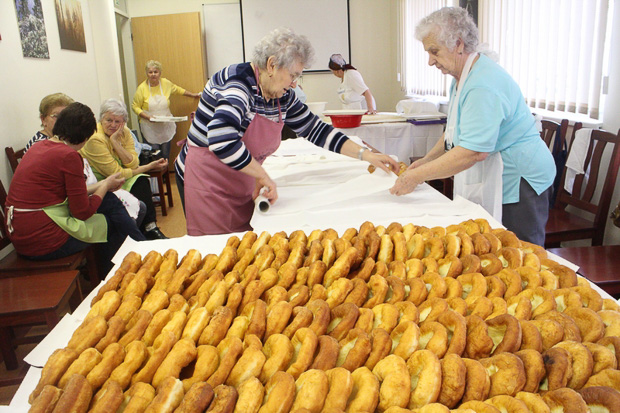 – Egy nagy adaghoz kell két liter tej, egy pici cukor és só, 25 dkg margarin, 2 tojás, 2 csomag élesztő, és egy kis rumot is löggyinthetünk bele. A liszt mennyisége változhat, 3-3,5 kg között van valahol, attól függően, mennyit vesz fel a tej– osztja meg Antal Andrásné Erzsike néni a biztos recept hozzávalóit, miközben a több órányi sürgés-forgás után ő is megenged magának néhány percnyi szusszanást.