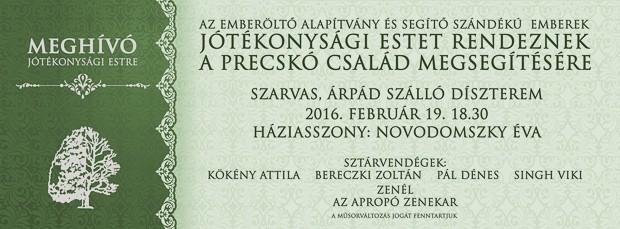 Az Alapítvány jótékonysági estet szervez február 19-én, melyhez az Árpád szálló díszterme biztosítja a helyszínt. A közreműködést olyan neves előadóművészek, mint Kökény Attila, Bereczki Zoltán, Singh Viki és Pál Dénes vállalták, az est háziasszonya pedig a szarvasi származású tévés személyiség, Novodomszky Éva lesz. Aki segíteni szeretne, 5000 Ft-ért vásárolhat belépőjegyet, és lehetőség van támogató jegyek vásárlására is, melynek teljes bevétele a család elkülönített számlájára kerül.