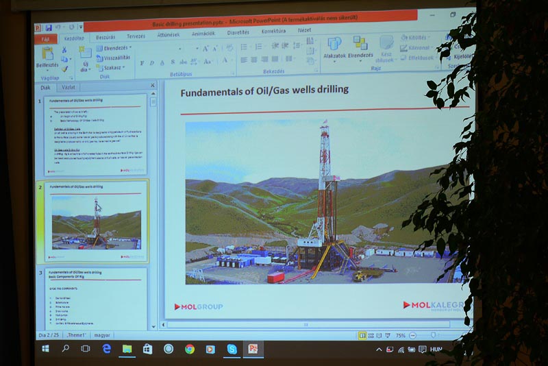 Szerdán a kőolaj nyomában a felszín alá tekintettünk Simon Balázs olajmérnök segítségével. A 9. évfolyam diákjai megismerkedhettek a szénhidrogének keletkezésével és a kutatás és feltárás alapvető problémáival. Az mindenki számára kiderült, hogy a kutatófúrások különleges technikai felkészültséget igényelnek, és hasonlóan különleges problémák merülhetnek fel. Végignéztük, hogy a fábiánsebestyéni gőzkitörést, hogyan számolták fel a külföldi szakértők. Láthattuk, hogy a berendezéseket a külső erők is veszélyeztetik. Az iraki homokvihar képei igazán félelmetesek voltak. Az is világossá vált, hogy ez a szakma lehetőséget ad arra is, hogy a kutatók külföldön vállaljanak munkát. Ez kivételes lehetőség más kultúrák megismerésére. Láthattuk a szíriai történelmi emlékeket, amikor még nem dúlta háború a területet, vagy azt hogyan ünnepelnek a pakisztániak a kutatófúrás sikere láttán. Ha valaki kedvet kapott a szakmához, annak irány a miskolci egyetem.