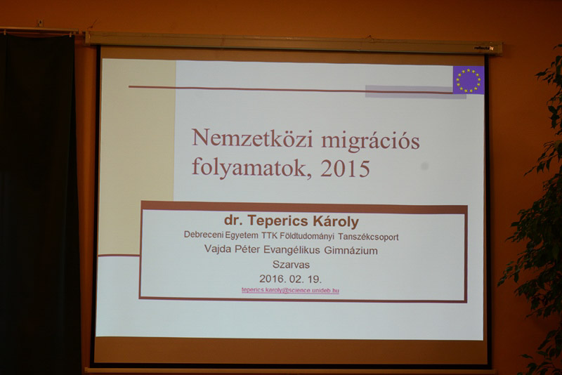 A Reál Hét utolsó napján, pénteken a 10. évfolyam olyan témáról hallhatott, mely mindenkit foglalkoztatott az elmúlt hónapokban, évben. Előadónk dr. Teperics Károly a Debreceni Egyetem Társadalomföldrajzi és Területfejlesztési Tanszékéről érkezett. A probléma tudományos és átfogó megközelítésében rendszerezte mindazokat a földrajzi és társadalmi-politikai tényezőket melyek a migrációs folyamatért felelősek. Kiderült, hogy a világ migrációs folyamatai békeidőben is intenzívek és sokrétűek, és sok esetben a befogadóknak is gazdasági szükségszerűség.
