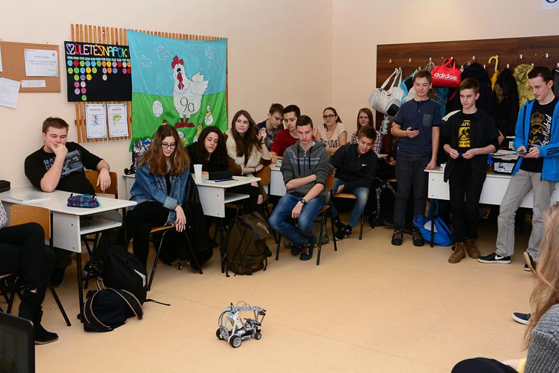Mialatt diákjaink versenyeztek, az itthoniak sem tétlenkedtek. A 9. évfolyamosok rendhagyó fizika óra keretében ismerkedhettek meg az idei évben indult Robot szakkör eddigi munkájával. A szakkör a Nemzeti Tehetség Program támogatásával valósul meg, és a tanulók digitális kompetenciáinak erősítését célozza, a programozás, a technika felé próbálja a tanulók érdeklődését irányítani.