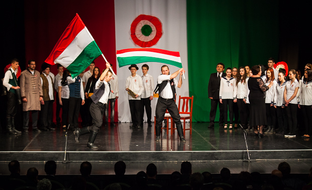 Szemerédi Bernadett és Nádházy Péter vezetésével a Himnusz közös eléneklésével kezdődött az idei március 15-i ünnepi megemlékezés. Az 1848-49-es forradalom és szabadságharc kirobbanásának 168. évfordulóját a GYSZC Székely Mihály Szakképző Iskolájának színjátszói és énekkara tették emlékezetessé. Műsorukban egy vidékről a fűvárosba gyalogló és a forradalmi események középpontjába csöppenő apa és fia történetén keresztül vezették be a nézőket a márciusi eseményekbe, amit ma a szerbiai Adán is előadnak.