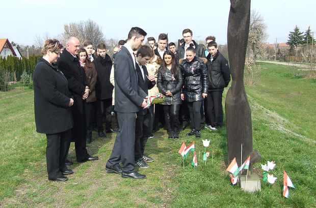Hortobágyi Pál történelemtanár szavai után elhelyezték az emlékezés koszorúját a emlékoszlopnál, majd közösen elénekelték nemzeti imánkat, a Himnuszt.