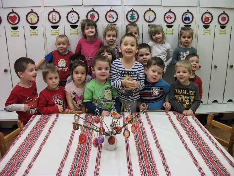 A munka végeztével szalagokat tűztünk a tojásokra és barkaágakra akasztottuk fel közösen. A gyerekek azóta is csodálva nézik az Alma csoport tojásfáját.”