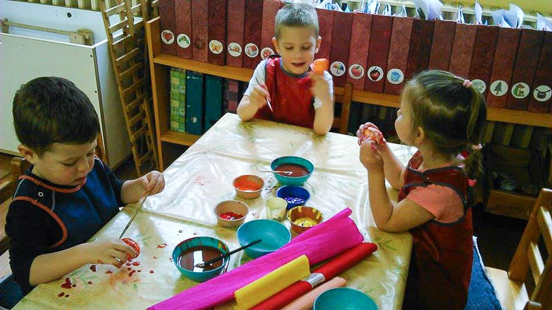 Hungarocell tojásokkal dolgoztunk, amiket vegyes technikával díszítettünk ki. Többségüket temperával festettük meg, ecsettel, illetve ujjfestéssel. Kiscsoportos gyerekeinkhez ez állt a legközelebb, hiszen a tojások festése közben remekül szórakoztunk. A tojások között található még krepp-papírral díszített tojás is, ami nagy odafigyelést igényelt a gyerekektől. Először apró bogyókat gyűrtünk a papírból mindenféle színből, majd ragasztópisztollyal – felnőtt felügyelettel – egyesével felragasztottuk a tojásokra. Nagy érdeklődéssel várták a végeredményt, mert ez a technika teljes újdonságnak bizonyult a kicsik számára.