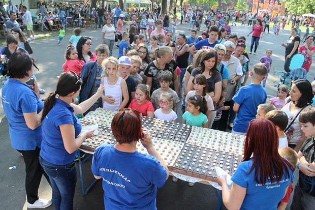 A nap végén a jutalom is megérkezett. Egy négyszáz szeletes tortát osztottak szét a vendégek között, amiből nemcsak a gyerekeknek, hanem köszönetképp a háttérben szorgoskodó szülői közösség tagjainak is jutott.