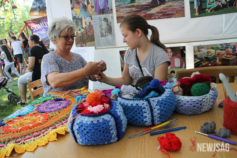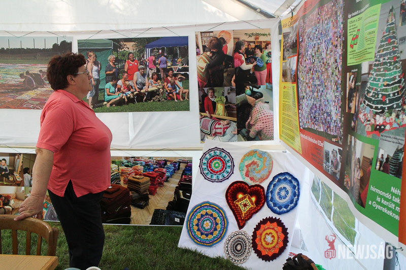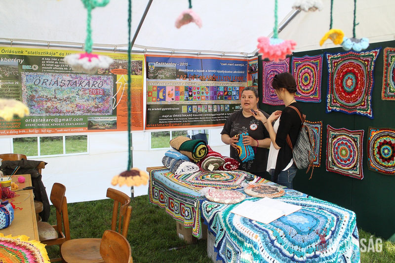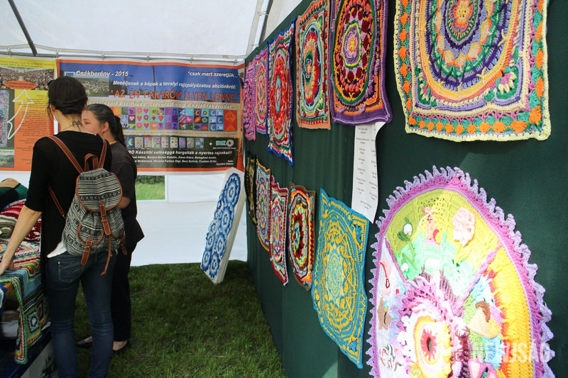 Az egyik sátorban horgolt takarók és mandalák vonzották a tekinteteket. A vándorkiállítás a Csákberényből indult óriástakarók ötletéből nőtte ki magát, amelynek darabkáival már több ezer gyermeket tettek boldoggá.