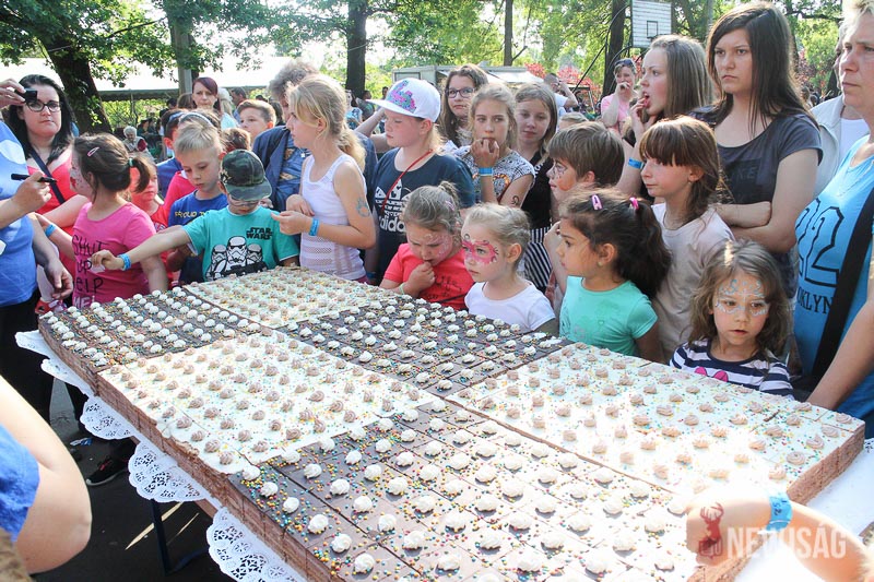 A nap végén a jutalom is megérkezett. Egy négyszáz szeletes tortát osztottak szét a vendégek között, amiből nemcsak a gyerekeknek, hanem köszönetképp a háttérben szorgoskodó szülői közösség tagjainak is jutott.