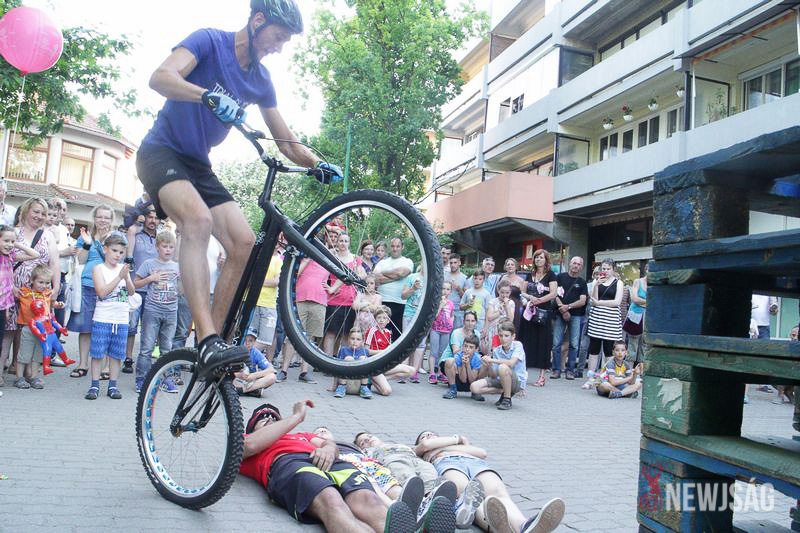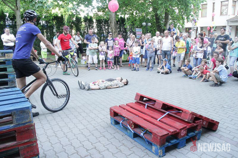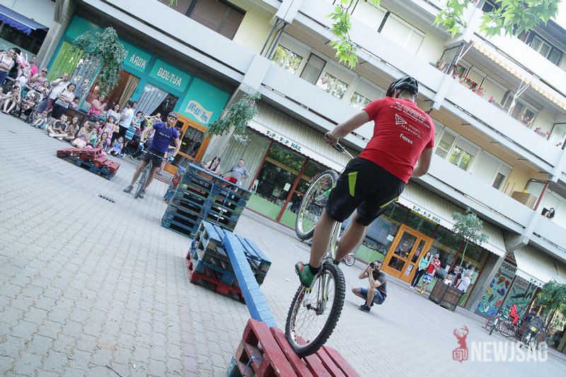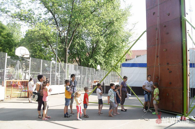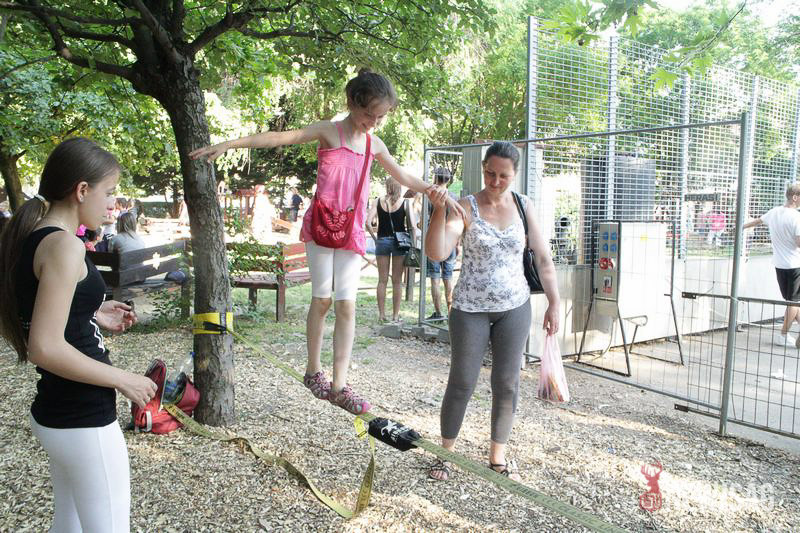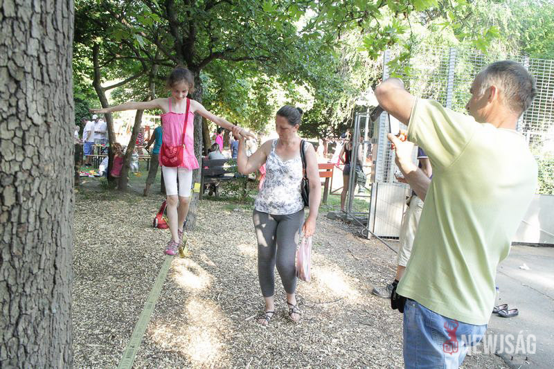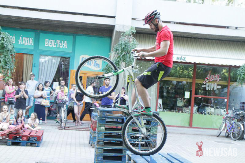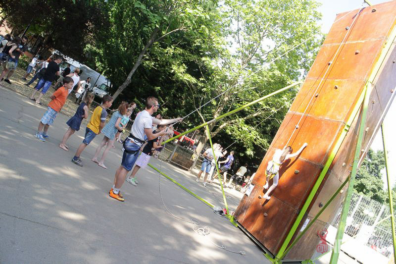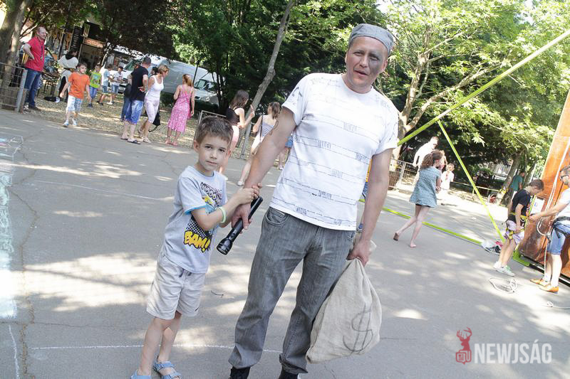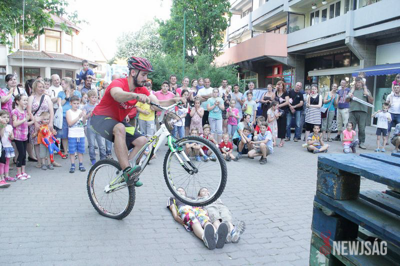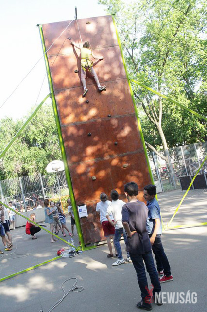 – Eleven gyereknapra eleven gyerekeket vártunk, akik látni, csinálni, alkotni szerettek volna. A kínálatok sorába egy újdonságot is bevezettünk: elmozdultunk az extrémsportok felé, és három ilyen jellegű elemet illesztettünk be a programok közé. Egyike ezeknek egy mászófal, amit több oldalról is meg lehet közelíteni, a másik egy egyensúlyozó pálya, ill. az esti órákban egy kerékpárshow várja majd a közönséget – tájékoztat a gyerekzsivajtól és az állandó jövésmenéstől hangos helyszínen Kugyeláné Décsei Mónika, a Cervinus Teátrum munkatársa.